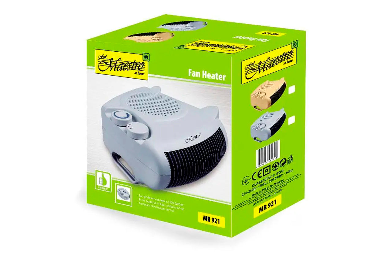 Компактный обогреватель Maestro MR-921 является тепловентилятором для исполнения на полу, который легко перемещается в нужное место. Модель управляется двумя удобными поворотными переключателями, расположенными на ее верхней панели. С помощью одного регулятора выбирается один из трех режимов работы: обогрев мощностью 1 кВт, обогрев мощностью 2 кВт и холодное обдувание без подогрева. Второй переключатель регулирует термостат, автоматически поддерживающий установленную температуру. Обогреватель Maestro MR-921 оборудован индикатором сети, загорающимся при включении прибора. Кроме того, он оснащен системой защиты от перегрева, выключающей устройство в аварийных ситуациях.