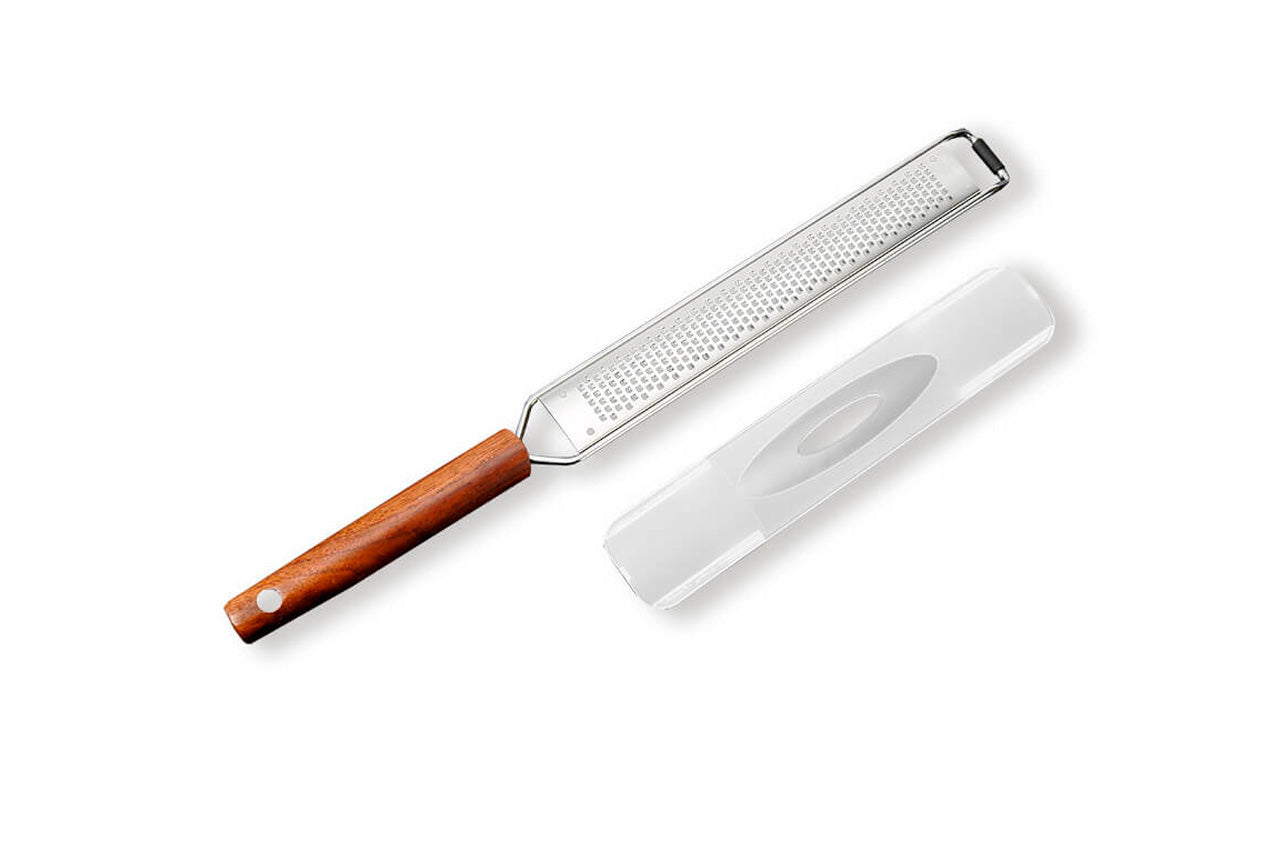 Плоская односторонняя терка подходит для натирания пармезана, цедры, шоколада, чеснока. Имеет ножку, на которую удобно опирать терку и с помощью которой можно размещать ее над посудой.