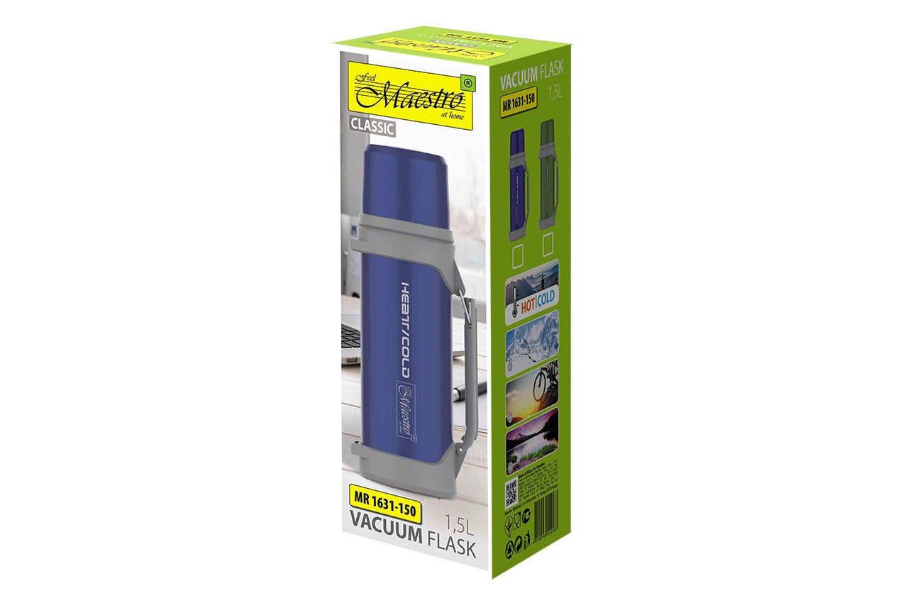 Термос Maestro MR 1631-100 New объемом 1 литр. Новая модель термоса МР 1631 выпускается в двух цветовых вариантах исполнения корпуса: синем и зеленом. Термос изготовлен из нержавеющей стали, устойчив к механическим воздействиям, легко моется и долго сохраняет тепло.