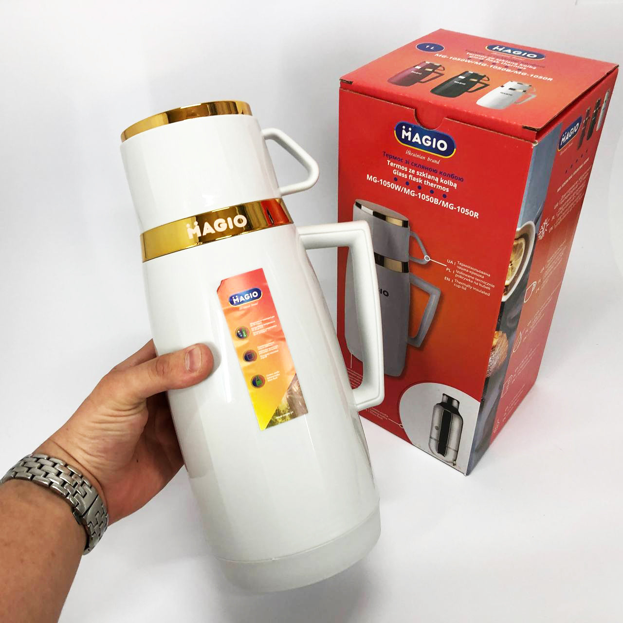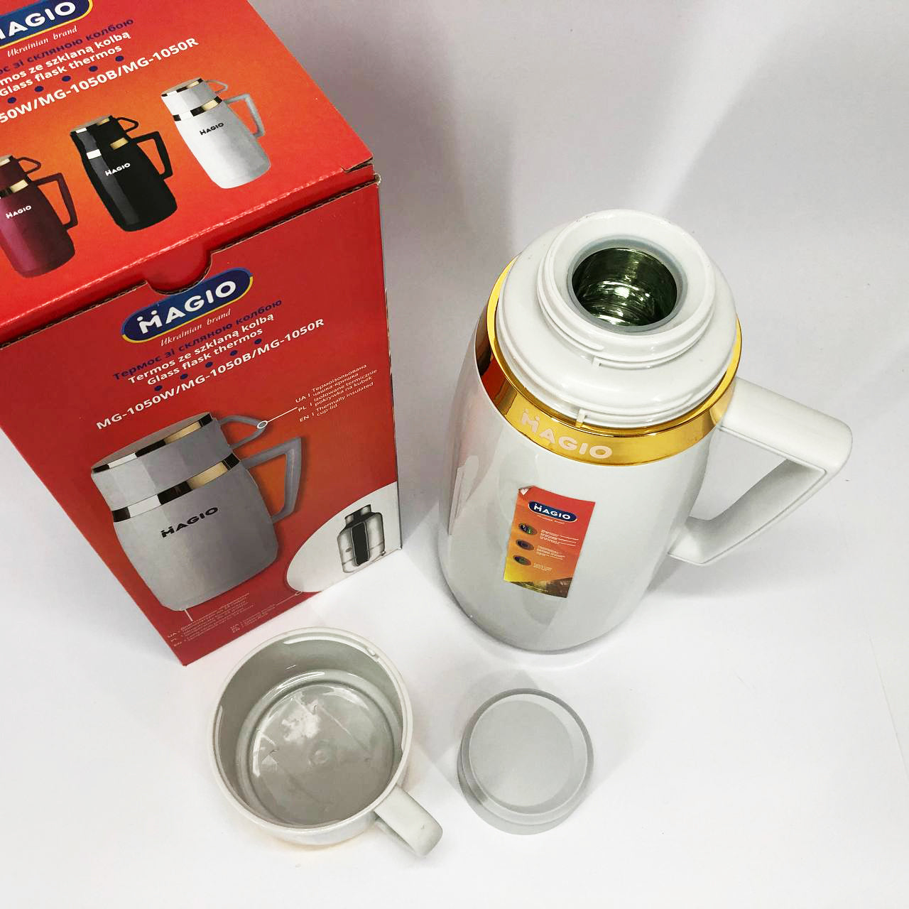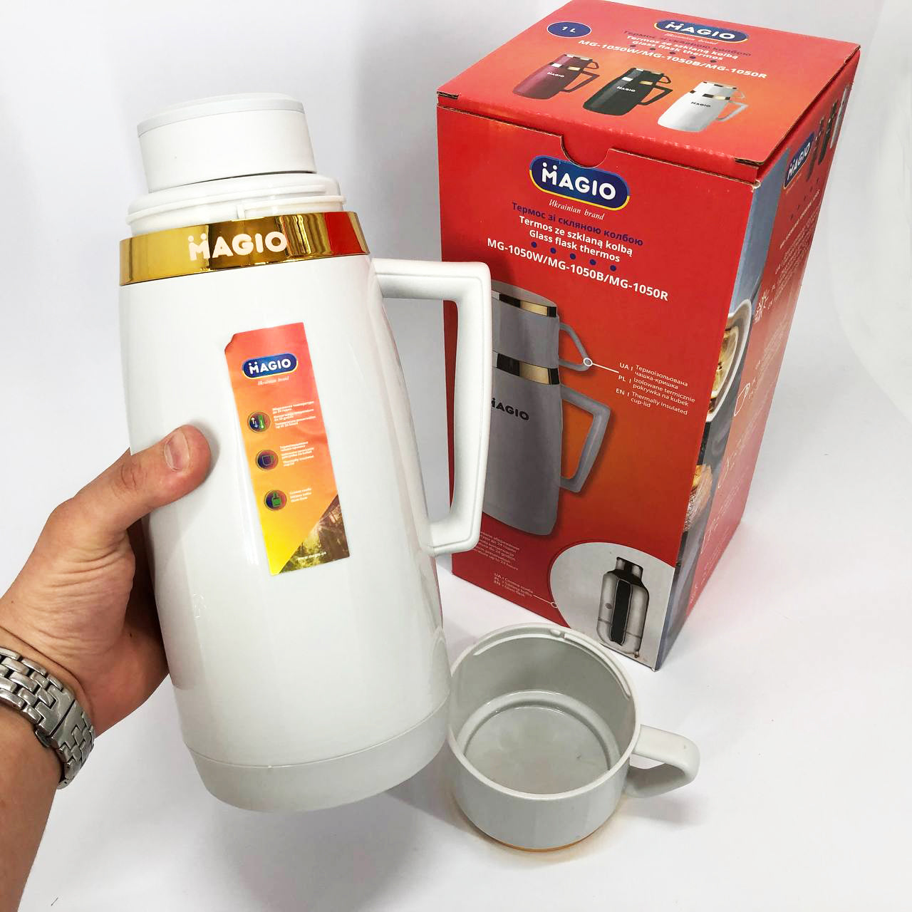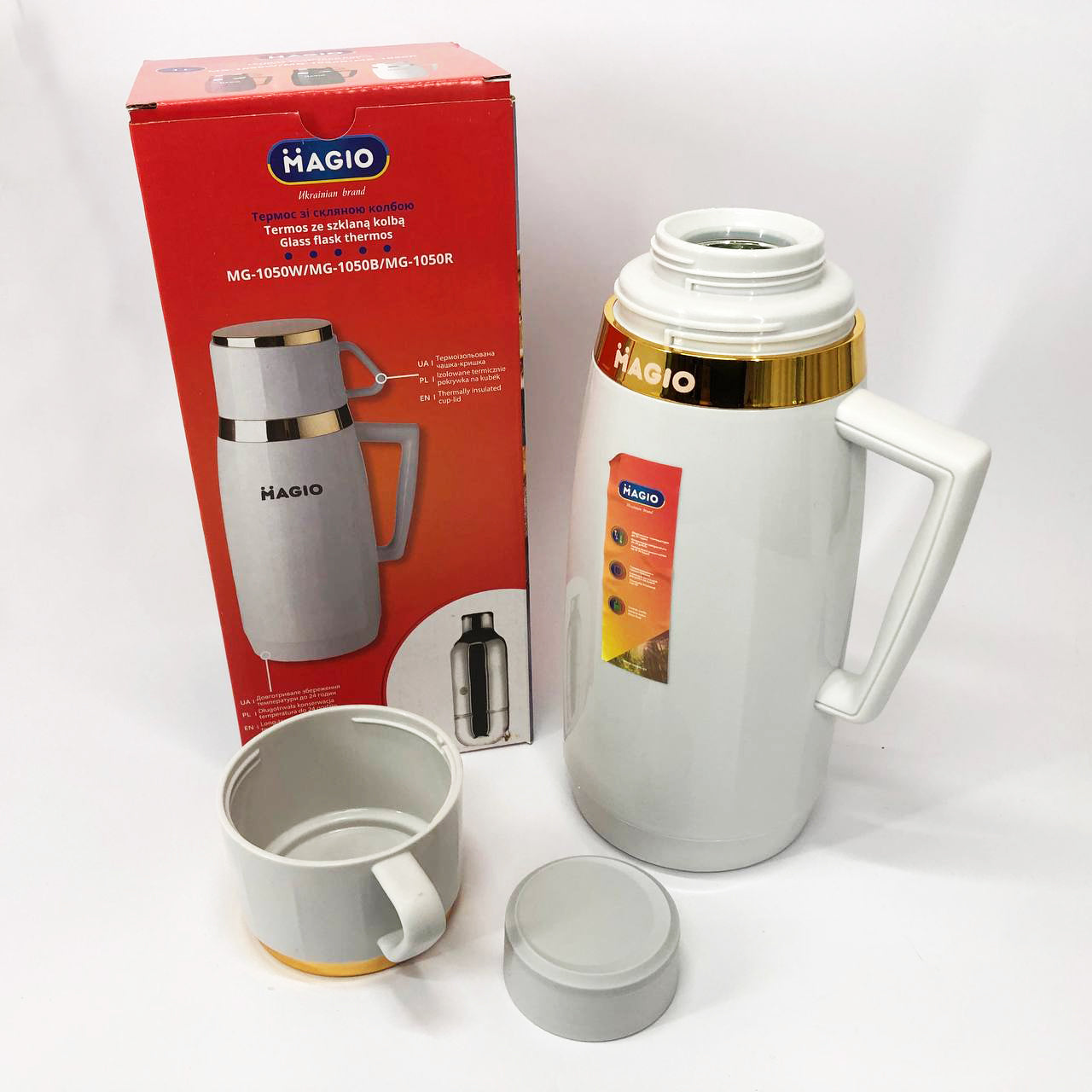 Термос Magio MG-1050W со стеклянной колбой, Хороший небольшой термос, для питьевой воды. Цвет: белый