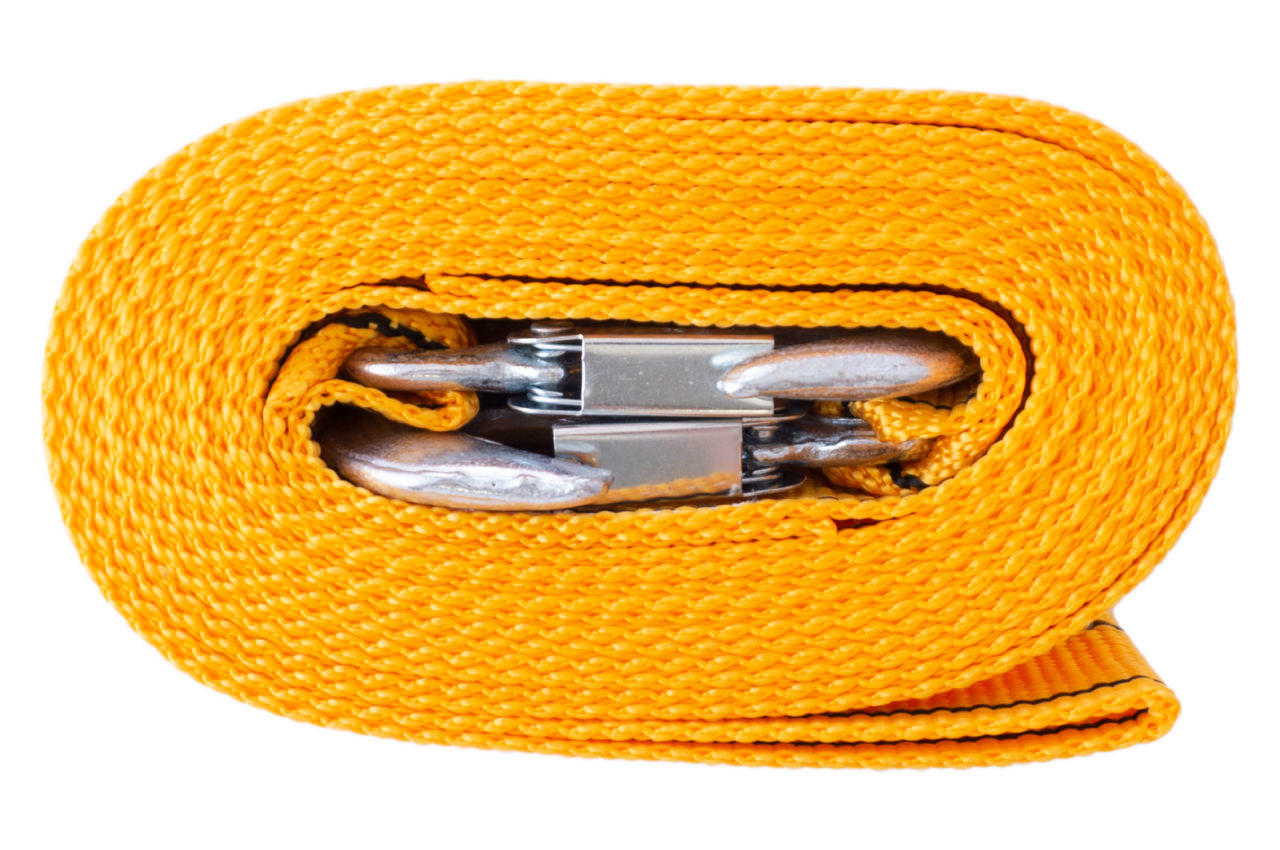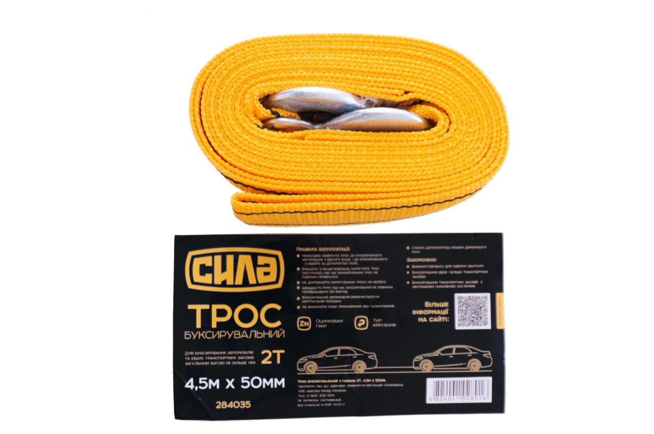 Трос буксировочный Сила – используется для буксировки транспортных средств. Максимальная нагрузка 2 т; Длина 4,5 м; Ширина: 50 мм. Материал полипропилен.