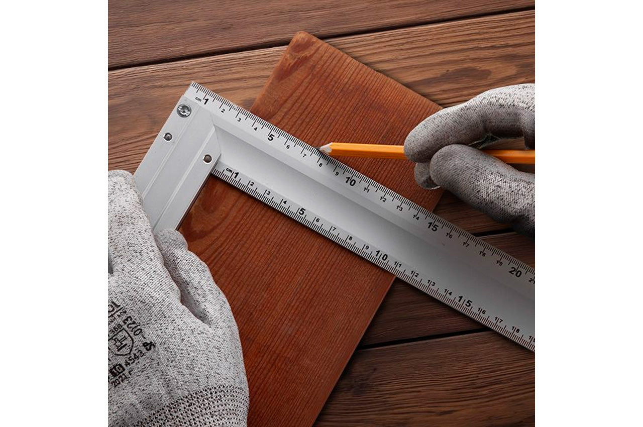 Угольник строительный алюминиевый MT-2062 необходим для разметки и определения прямых углов. Двустороннее плечо инструмента с нанесением разметки с обеих сторон позволит максимально просто и точно сделать отметки даже в самых труднодоступных местах. Алюминиевый сплав в качестве материала изготовления делает строительный угольник MT-2062 устойчивым к коррозии, влаге и другим условиям окружающей среды. Дополнительные ребра жесткости сохранят ровность измерительной поверхности. Плечо закреплено в колодке двумя заклепками и дополнительным винтом, что предотвращает его расшатывание и обеспечивает максимальный срок службы инструмента. Плечо: 175х34х12 мм; Колодка: 307х40х3 мм