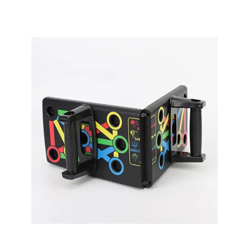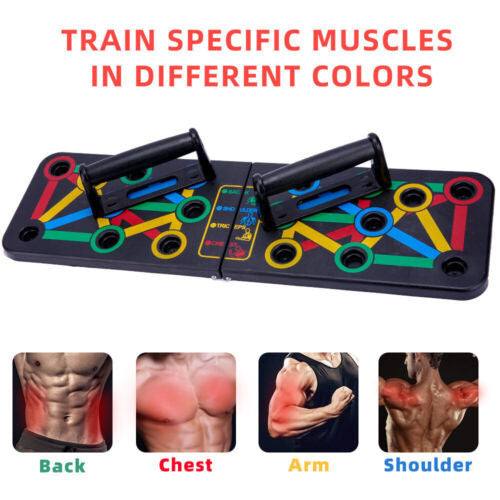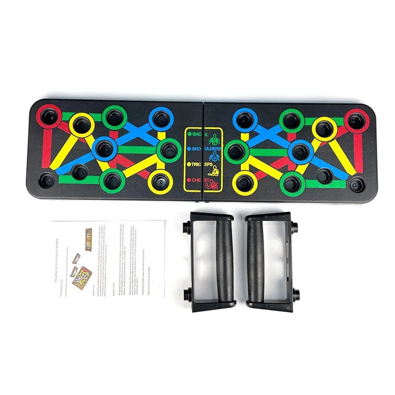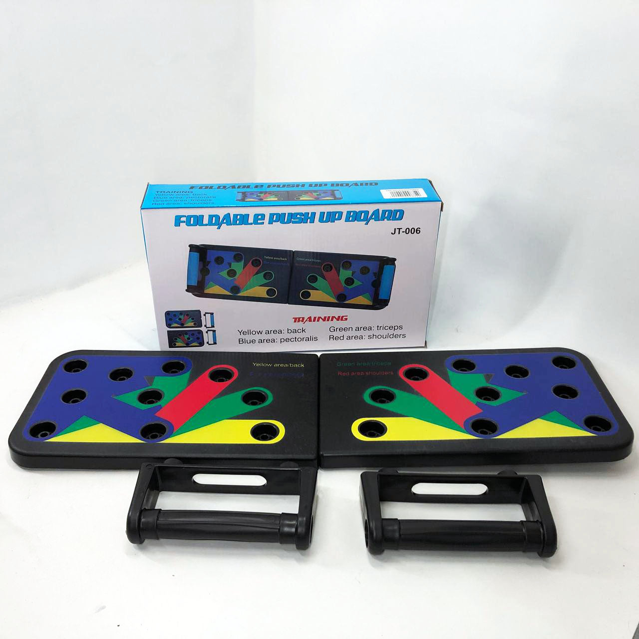 Многофункциональный тренажер для отжиманий Push Up JT-006 с цветной разметкой укрепляет и формирует всю верхнюю часть тела (грудь, плечи, спину и руки). Каждому цвету соответствует определенная группа мышц (синий – грудь, красный – плечи, желтый – спина, зеленый – трицепсы). Возможность менять положение и угол упора позволят максимально задействовать необходимые мышцы.