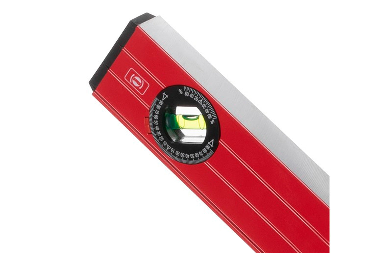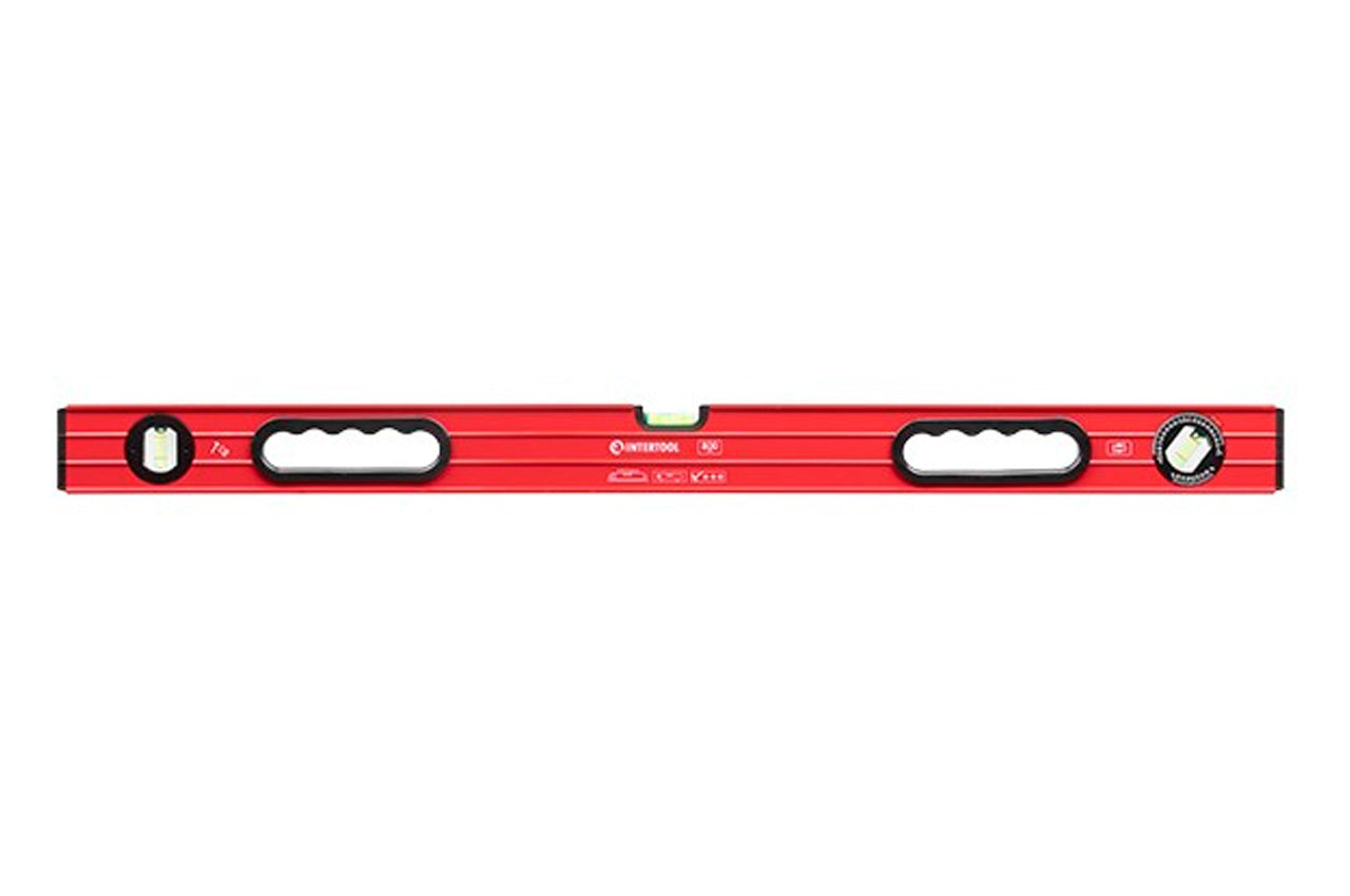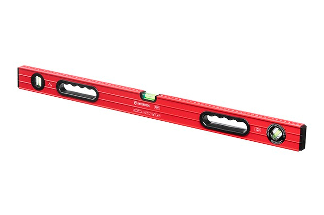 Уровень Intertool MT-1268 с поворотной капсулой предназначается для определения состояния различных поверхностей. Длина измерительного прибора составляет 800 мм или 0,8 метра, а корпус изготовлен из алюминиевого профиля толщиной 1,2 мм. Прибор оснащен двумя удобными рукоятками с прорезиненным основанием. На корпусе имеется горизонтальная капсула, которая является основной, вертикальная, а также поворотная для определения угла отклонения измеряемой поверхности. Торцевые части инструмента имеют пластиковое покрытие, которое исключает попадание внутрь прибора различных засорений, а также предотвращает получением травмы пользователем. Строительный пузырьковый уровень является одним из главных инструментов строителя, при помощи которого не только контролируется процесс сооружения стен, полов и прочих перекрытий, но еще и определяется их ровность после завершения работ.