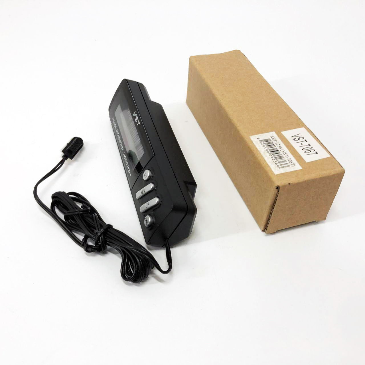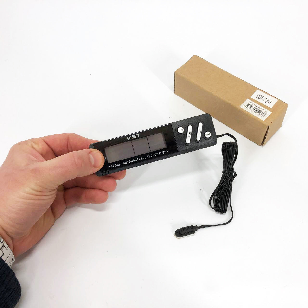 Электронный градусник показывает температуру внутри помещения и снаружи, а также время. Прибор идеально подходит для использования в автомобилях.