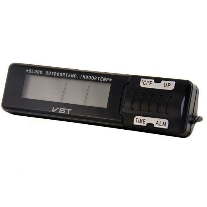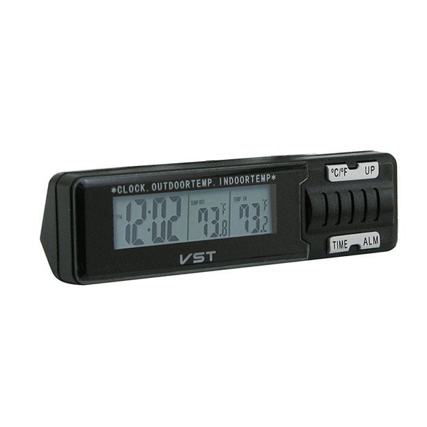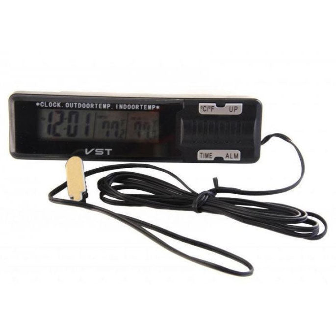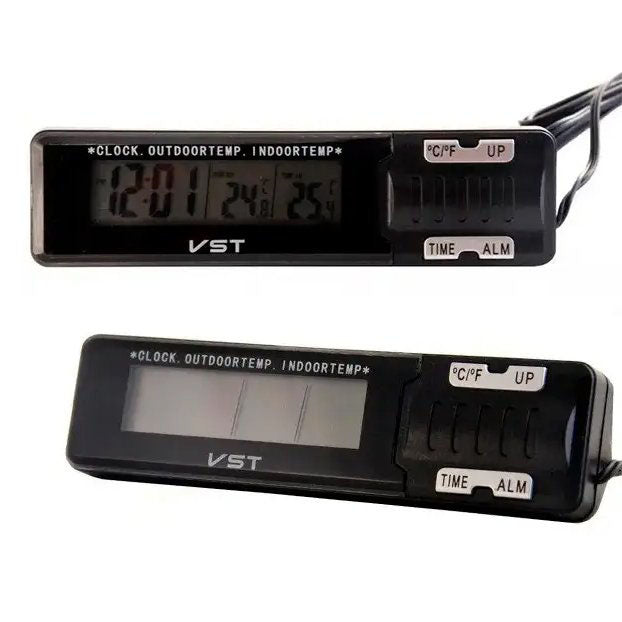 Электронный градусник показывает температуру внутри помещения и снаружи, а также время. Прибор идеально подходит для использования в автомобилях.