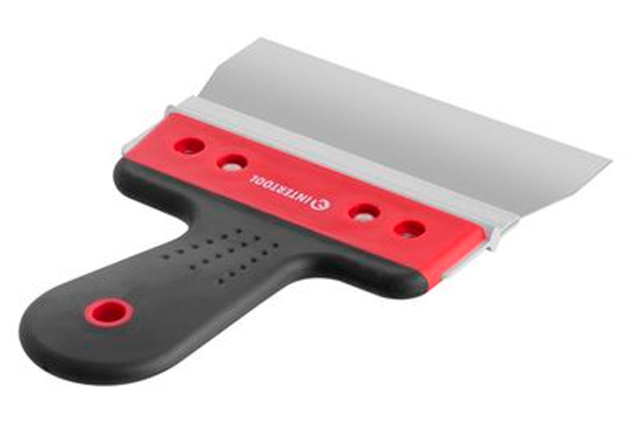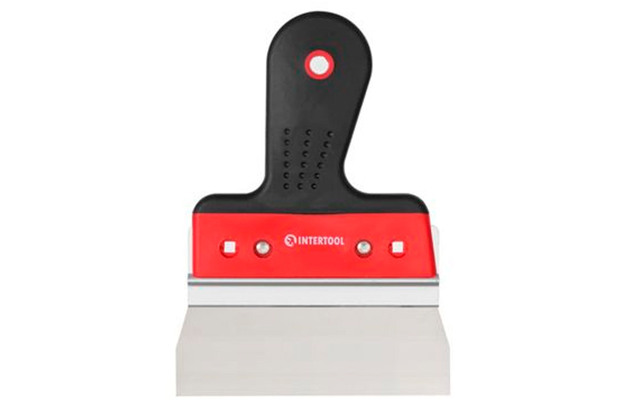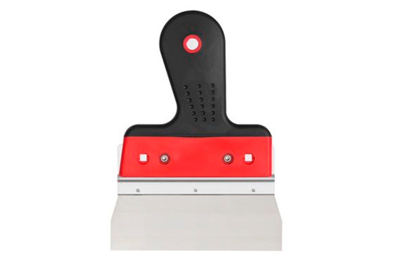 Фасадный шпатель предназначен для нанесения и выравнивания шпаклевок, штукатурных растворов и других строительных материалов по поверхности. Шпатель изготовлен из высококачественных материалов. Полотно шпателя из нержавеющей стали, имеет алюминиевую вставку с ребром жесткости, что усиливает конструкцию и позволяет выполнять работы на больших поверхностях. Рукоять из пластика и направляющая из алюминия делают шпатель достаточно легким и удобным в использовании.