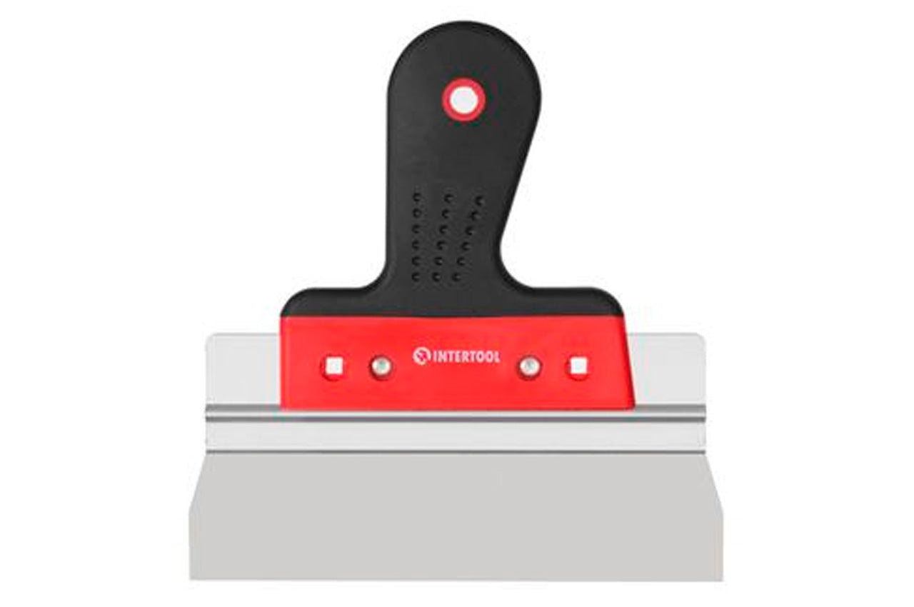 Фасадный шпатель предназначен для нанесения и выравнивания шпаклевок, штукатурных растворов и других строительных материалов по поверхности. Шпатель изготовлен из высококачественных материалов. Полотно шпателя из нержавеющей стали, имеет алюминиевую вставку с ребром жесткости, что усиливает конструкцию и позволяет выполнять работы на больших поверхностях. Рукоять из пластика и направляющая из алюминия делают шпатель достаточно легким и удобным в использовании.
