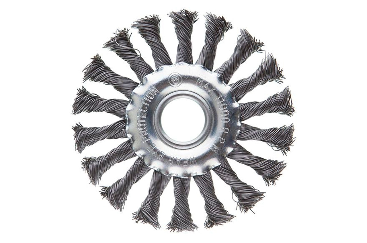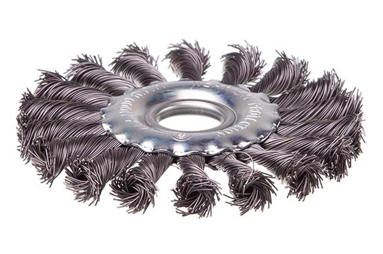 Щетка дисковая с плетеной проволокой. Предназначена для работ по дереву, бетону, металлу и лакокрасочным покрытиям. Диаметр щетки 115 мм, посадочного отверстия - 22,2 мм. Толщина проволоки 0,5 мм. Скорость вращения: 11000 об/мин. Тип проволоки: плетенная проволока; Скорость вращения: 11000 об/мин; Диаметр щетки: 115 мм; Диаметр проволоки: 0,5 мм; Диаметр посадочного отверстия: 22,2 мм; Применение: для дерева, бетона, металла и лакокрасочных покрытий