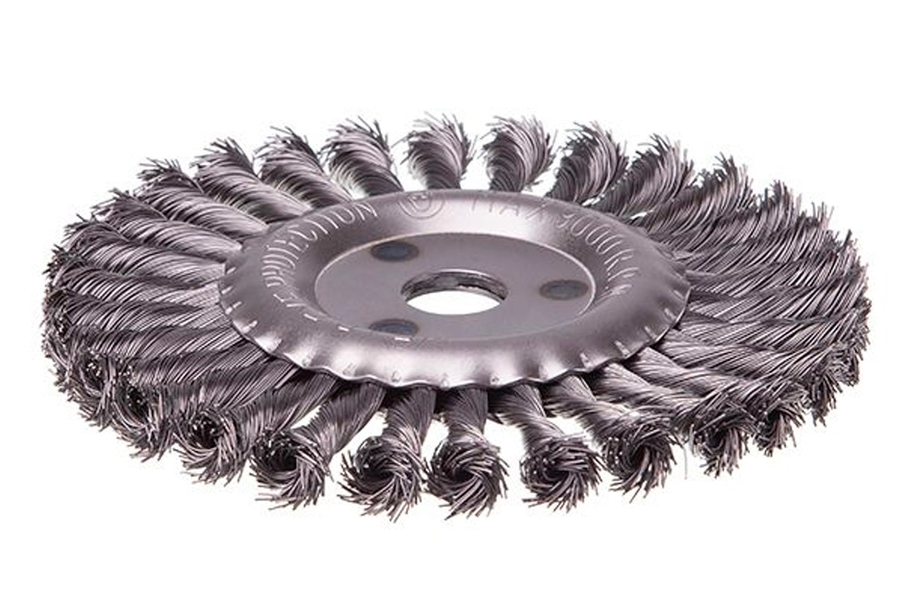 Щетка дисковая с плетеной проволокой. Предназначена для работ по дереву, бетону, металлу и лакокрасочным покрытиям. Диаметр щетки 180 мм, посадочного отверстия - 22,2 мм. Толщина проволоки 0,5 мм. Скорость вращения: 9000 об/мин. Тип проволоки: плетенная проволока; Скорость вращения: 9000 об/мин; Диаметр щетки: 180 мм; Диаметр проволоки: 0,5 мм; Диаметр посадочного отверстия: 22,2 мм; Применение: для дерева, бетона, металла и лакокрасочных покрытий
