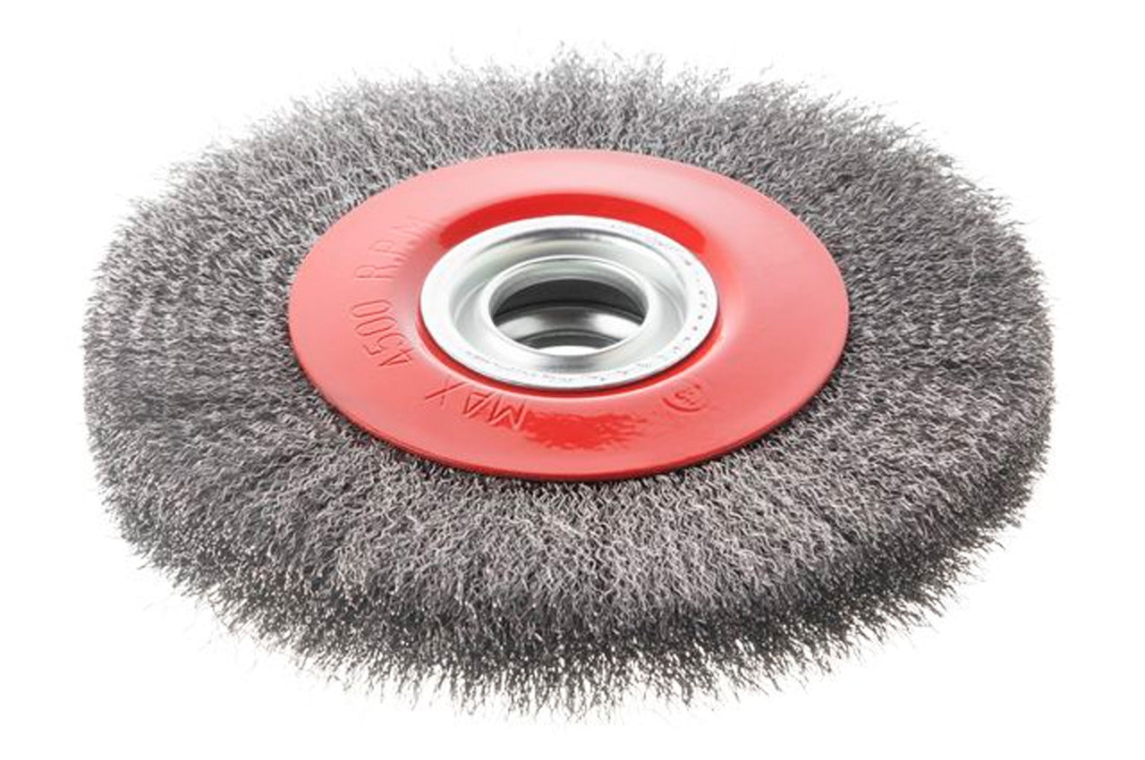 Щетка дисковая с рифленной проволокой. Предназначена для работ по дереву, бетону, металлу и лакокрасочным покрытиям при оборотах не более 4500 об/мин. Диаметр щетки 200 мм, посадочного отверстия - 32 мм. Тип проволоки: рифленная проволока; Скорость вращения: 4500 об/мин; Диаметр щетки: 200 мм; Диаметр проволоки: 0,3 мм; Диаметр посадочного отверстия: 32 мм; Применение: для дерева, бетона, металла и лакокрасочных покрытий