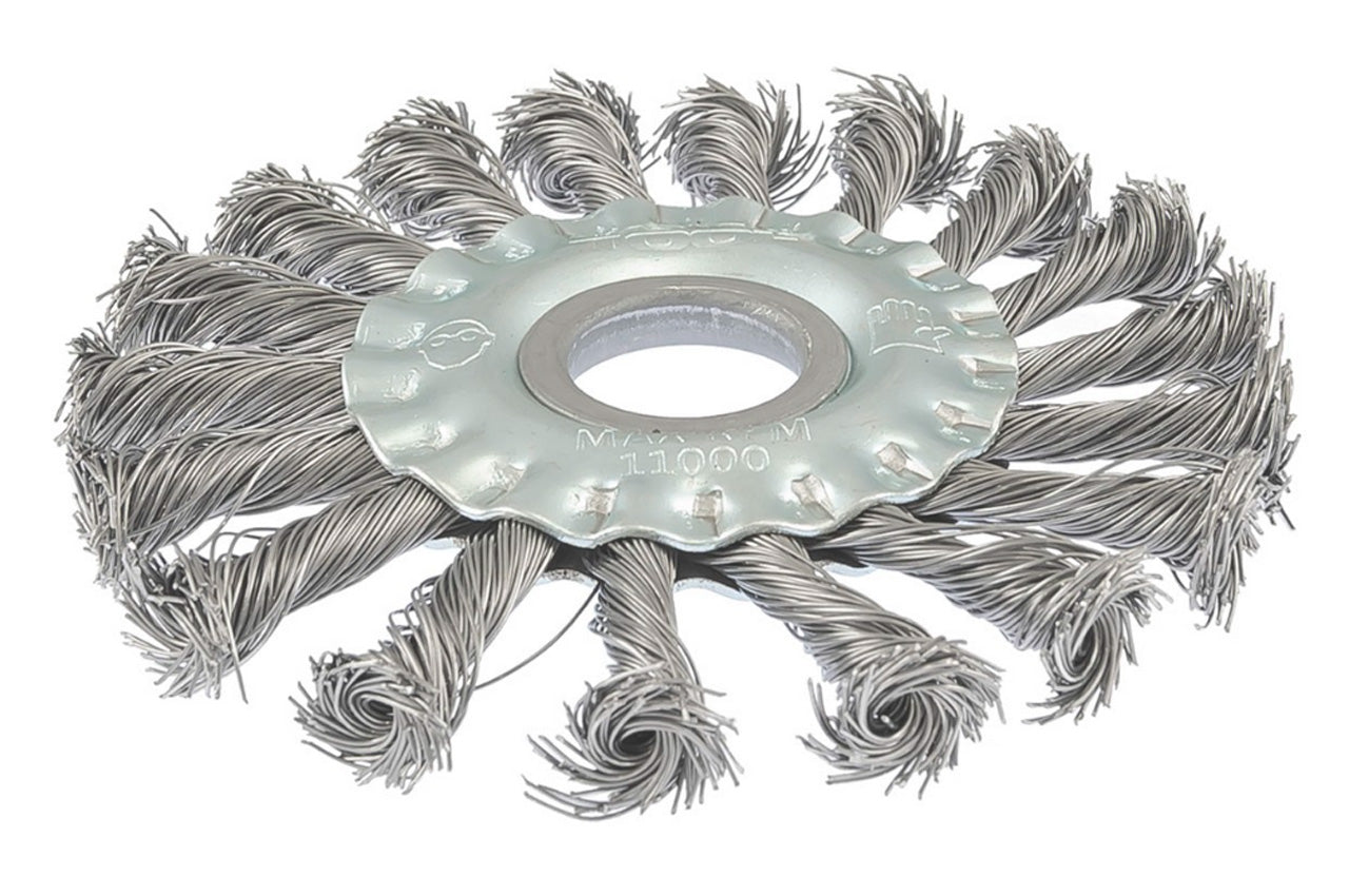 Щетка дисковая с плетеной проволокой. Предназначена для работ по дереву, бетону, металлу и лакокрасочным покрытиям. Диаметр щетки 115 мм, посадочного отверстия - 22,2 мм. Толщина проволоки 0,5 мм. Скорость вращения: 11000 об/мин.