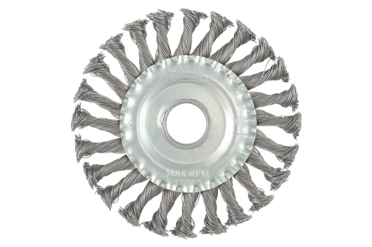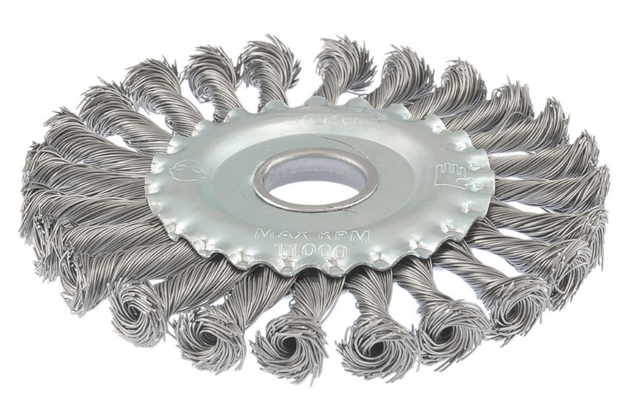 Щетка дисковая с плетеной проволокой. Предназначена для работ по дереву, бетону, металлу и лакокрасочным покрытиям. Диаметр щетки 125 мм, посадочного отверстия - 22,2 мм. Толщина проволоки 0,5 мм. Скорость вращения: 11000 об/мин.