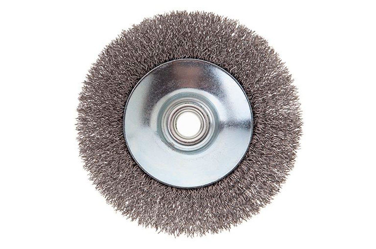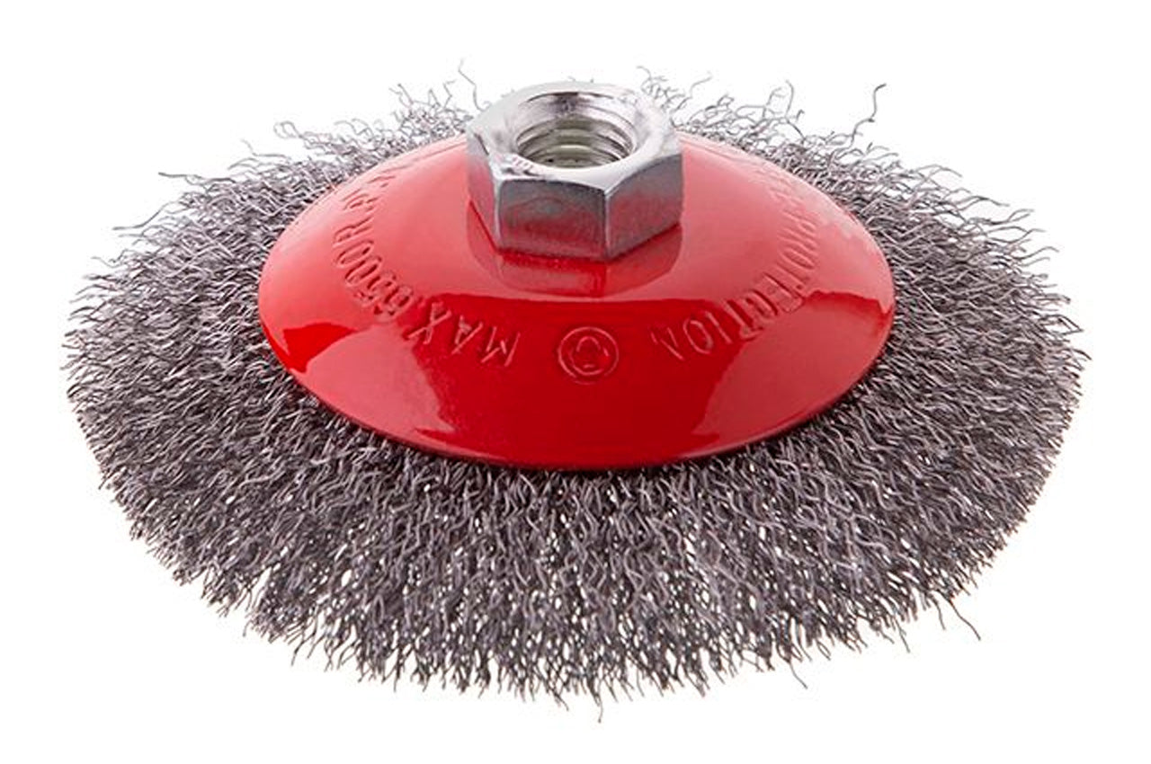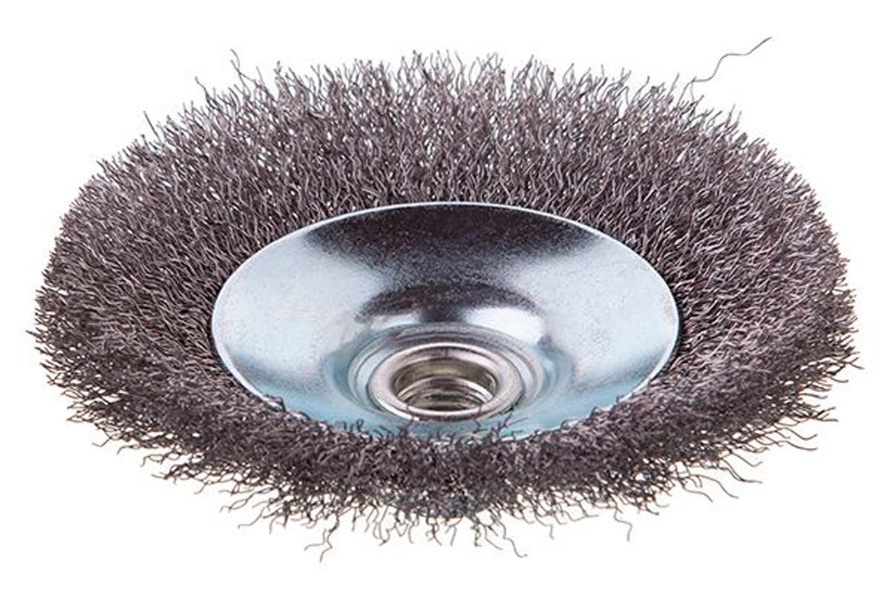 Щетка конусная с рифленной проволокой для УШМ. Предназначена для работ по дереву, бетону, металлу и лакокрасочным покрытиям. Диаметр 115 мм. Толщина проволоки 0,3 мм. Скорость вращения: 12500 об/мин Тип проволоки: рифленная проволока; Скорость вращения: 6500 об/мин; Диаметр щетки: 115 мм; Диаметр проволоки: 0,3 мм; Держатель: М14; Применение: для дерева, бетона, металла и лакокрасочных покрытий