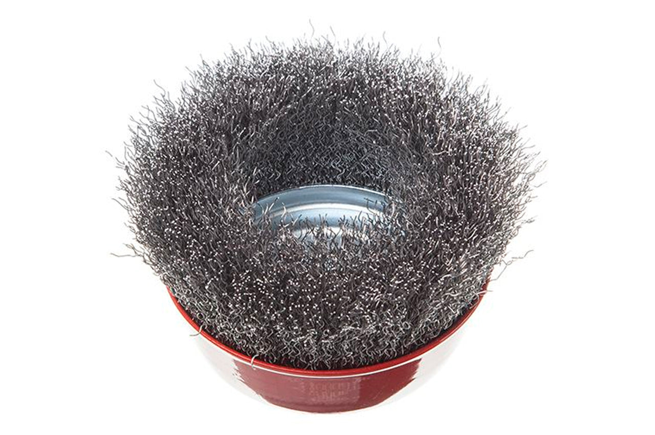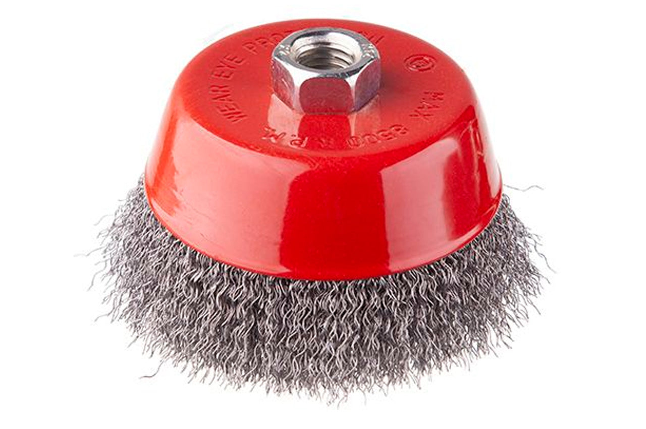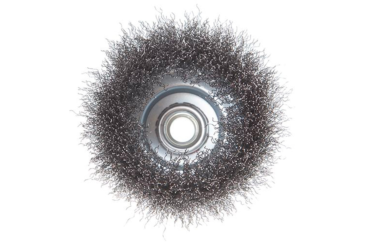 Щетка торцевая (чашечная) с рифленной проволокой для УШМ. Предназначена для работ по дереву, бетону, металлу и лакокрасочным покрытиям. Диаметр 100 мм. Скорость вращения: 8500 об/мин Тип проволоки: рифленная проволока; Скорость вращения: 8500 об/мин; Диаметр щетки: 100 мм; Диаметр проволоки: 0.3 мм; Держатель: М14; Применение: для дерева, бетона, металла и лакокрасочных покрытий