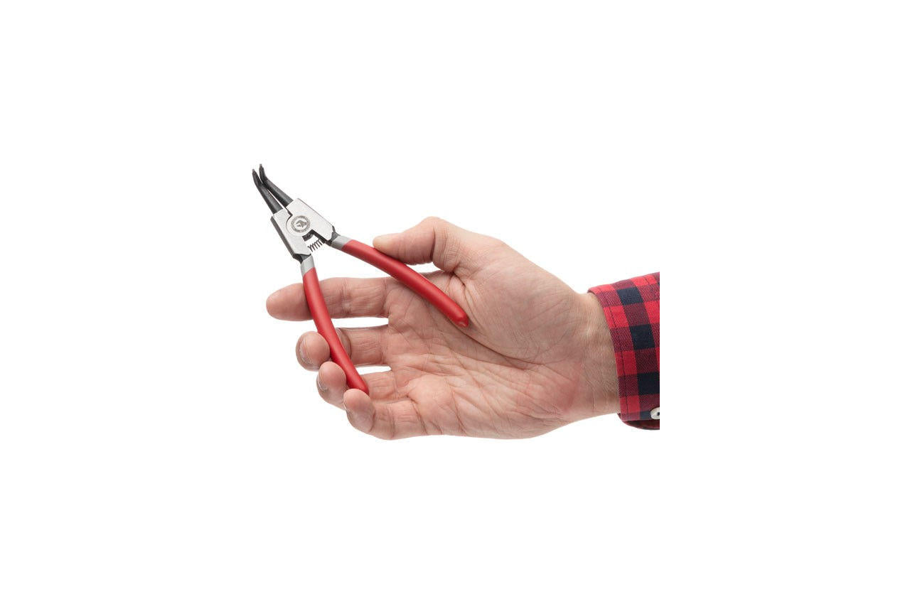 Изогнутые щипцы на разжим длиной 150 мм - незаменимый инструмент, в случае, когда необходимо аккуратно и быстро установить или снять стопорные кольца. Прецизионные, точные наконечники щипцов имеют специальную форму, которая предотвращает срыв и деформацию стопорного кольца. Щипцы также прошли специальную термическую обработку для достижения высокой жесткости. Ручки щипцов с противоскользящим покрытием, не скользят и обеспечивают комфортную работу.