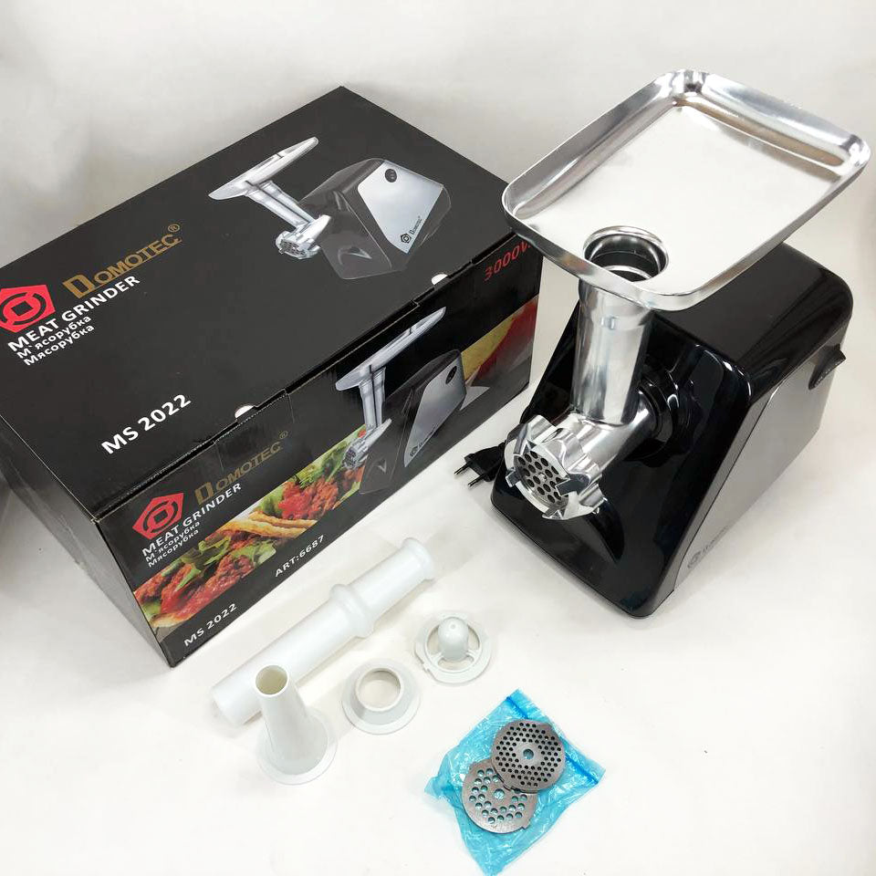 Электрическая мясорубка Domotec MS-2022 2800W Черная - это прекрасное приспособление, которое сэкономит максимум времени во время приготовления фарша и колбас. Мощность мясорубки составляет 2800 Вт. 3 сеточки для мяса с отверстиями разного диаметра позволяют регулировать степень помола. При помощи насадки “кеббе” и насадки для сосисок вы сможете порадовать своих близких ароматными колбасами. Корпус мясорубки выполнен из прочного металла и пластика. Функция реверса позволяет решить проблему наматывания жил на шнек во время обработки мяса. Достаточно остановить мотор, нажать на кнопку реверса, и причина засорения будет устранена. Простая, удобная и надежная мясорубка MS-2022 станет вашей верной помощницей на кухне.