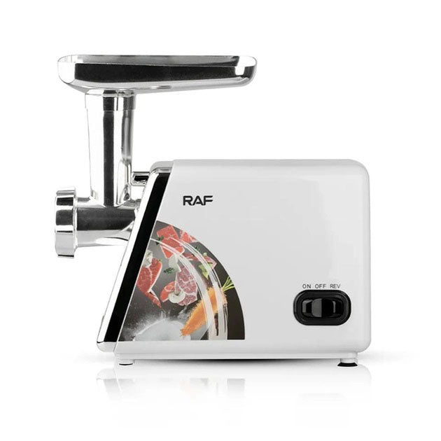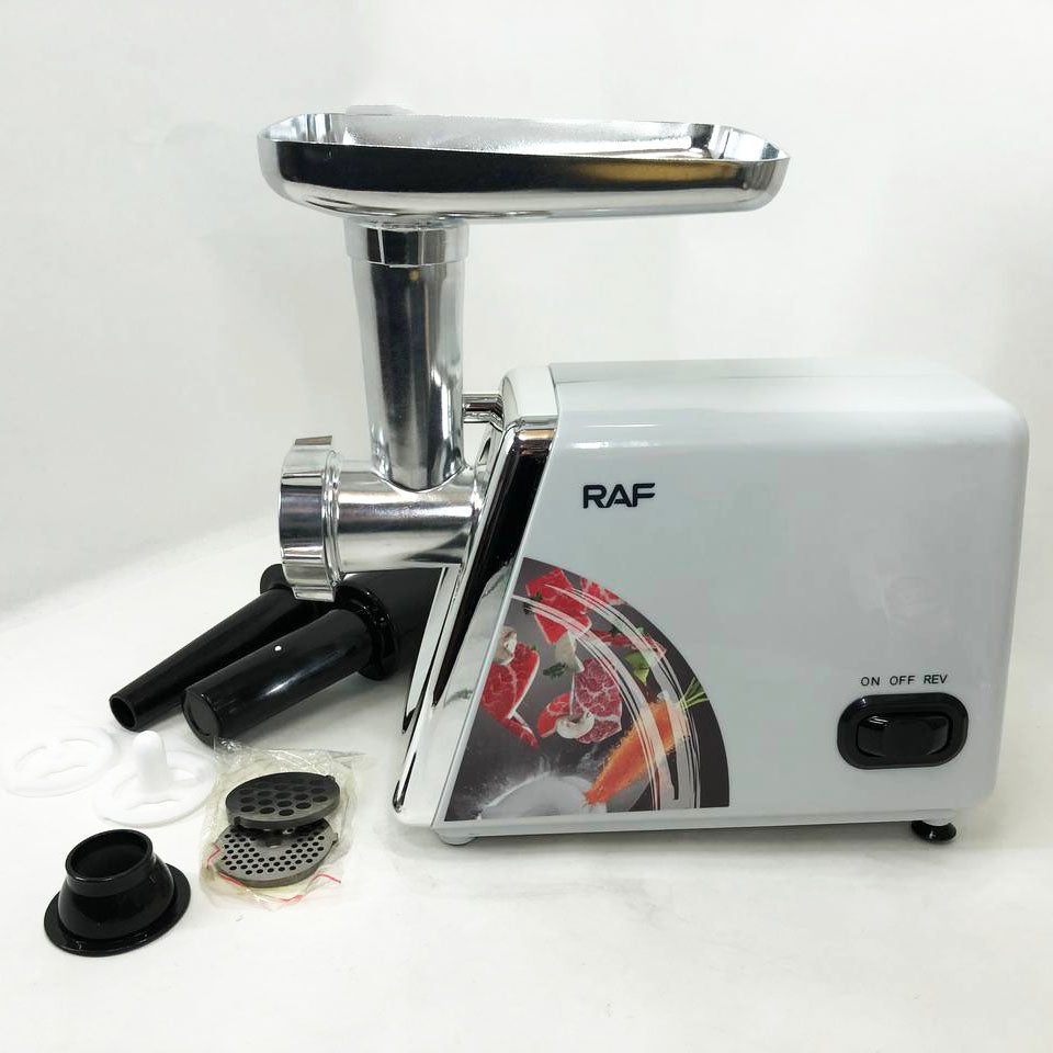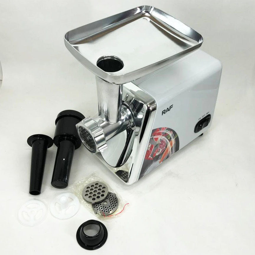 RAF R.3368 – мощная электромясорубка с потрясающей производительностью в 2.5 кг/мин, способная перемалывать даже самое жёсткое мясо. Мясорубка оснащена 4 сменными насадками – для колбас/сосисок, для фарша, и насадка-кеббе. Корпус мясорубки выполнен из качественного пластика, а все части, которые соприкасаются с мясом – из нержавеющей стали.