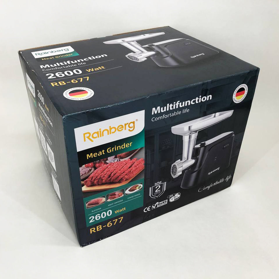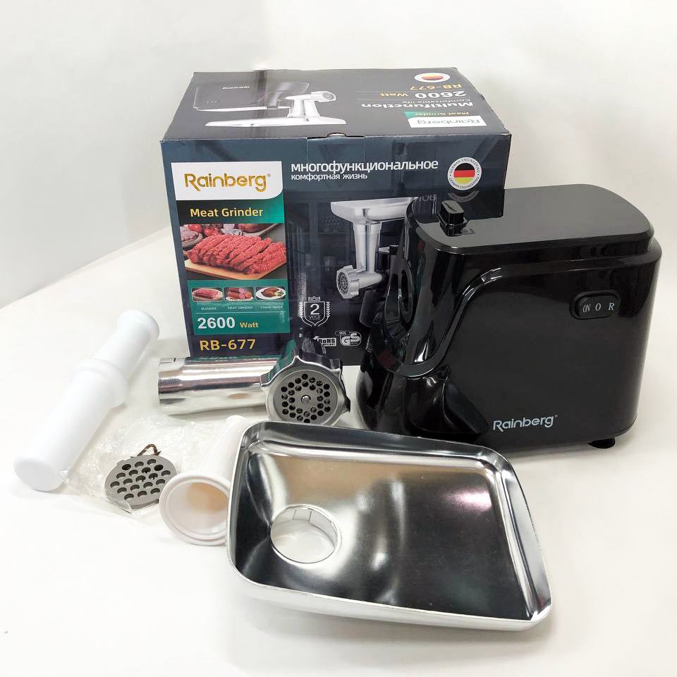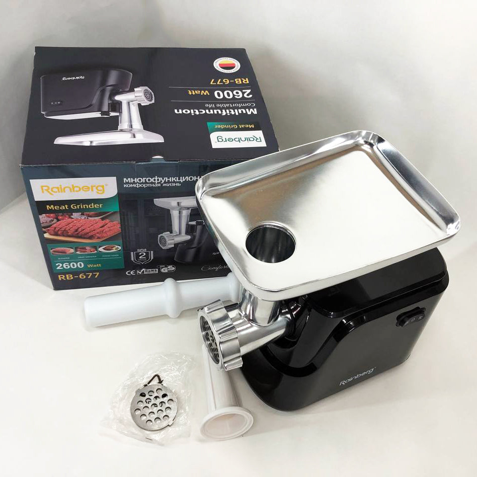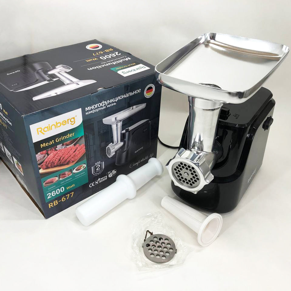 Это компактная и производительная электрическая шнековая мясорубка с функциями реверса и подавления шума от надёжного и проверенного производителя. Благодаря своим компактным размерам она не займет много места на кухне. Мясорубка Rainberg RB-677 – отличный выбор, если вам нужно быстро сделать фарш.С помощью насадки для колбас, Вы сможете сделать домашние колбаски собственного приготовления. Функция обратного вращения ножей (реверс) поможет вам, если внутри прибора создалось уплотнение из продуктов.