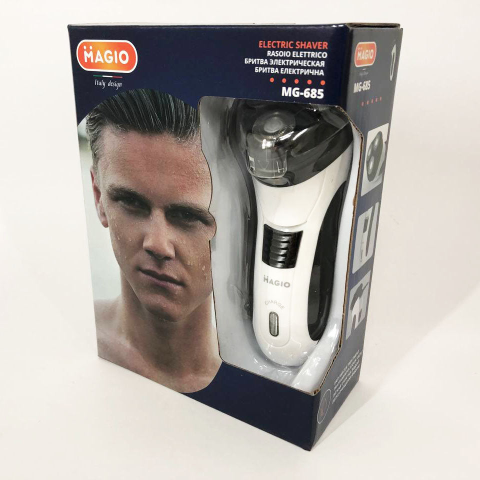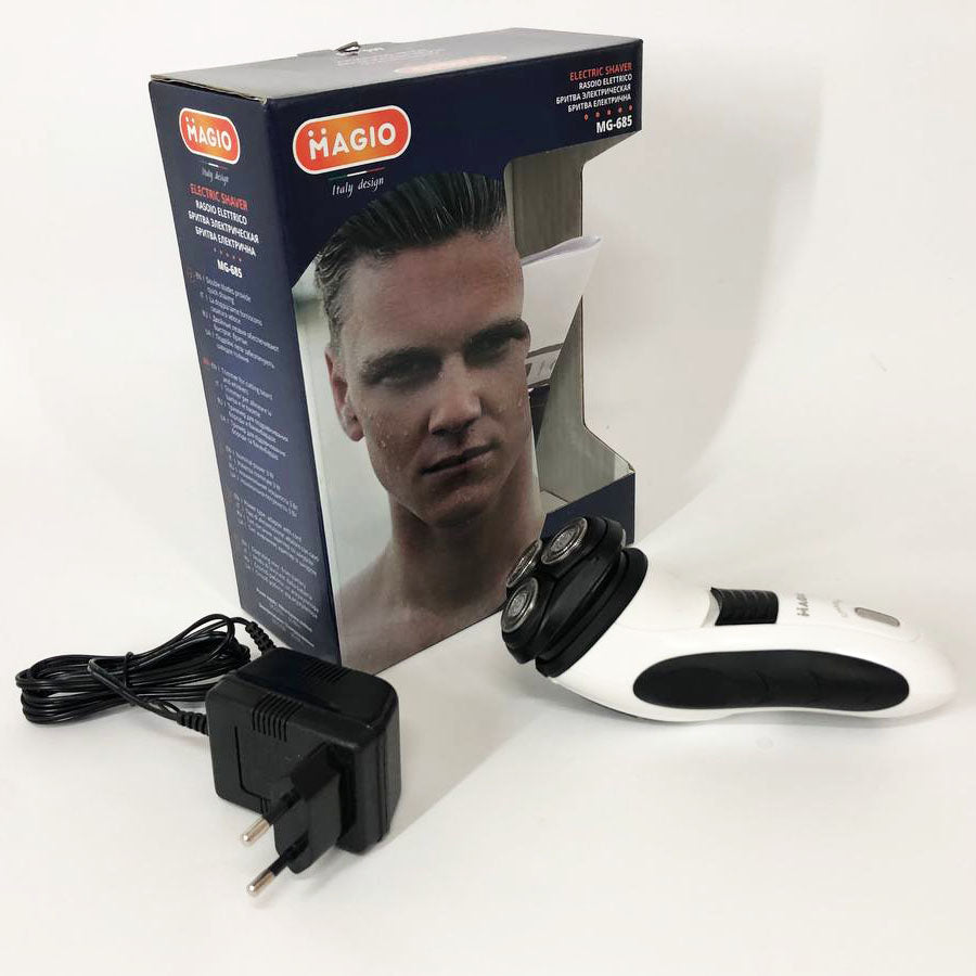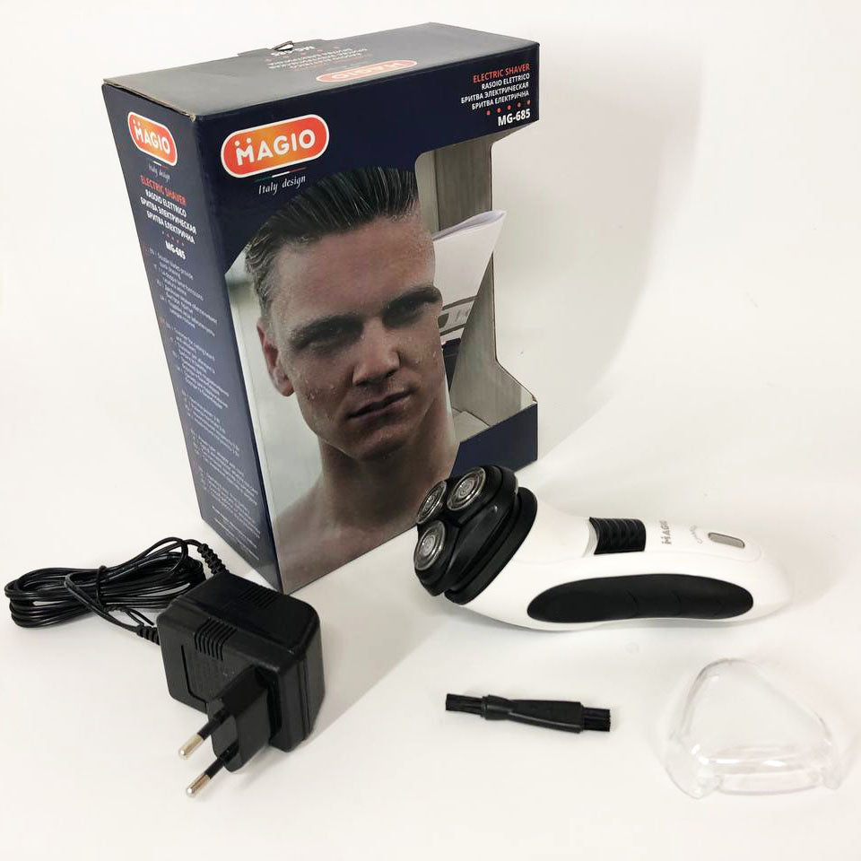 Электробритва MAGIO MG-685 для влажного и сухого бритья с тремя подвижными бритвенными головками обеспечит идеальный результат за счет плотного прилегания вращающихся лезвий к коже. Эта модель роторной бритвы с качественными двойными лезвиями и системой повторения контуров лица деликатно относится к коже. Аккумулятора после 8-ми часовой зарядки хватает на 30 минут автономной работы.