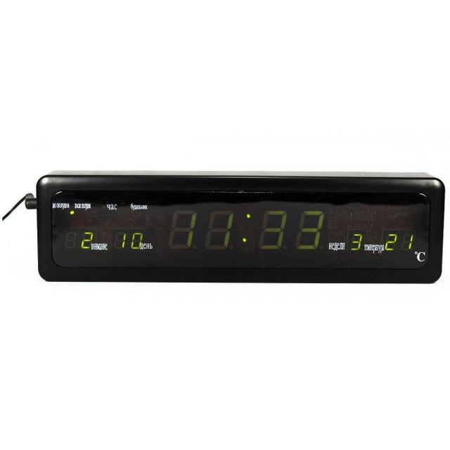 LED циферблат зеленого цвета, на нем отображается время, дата и температура воздуха.