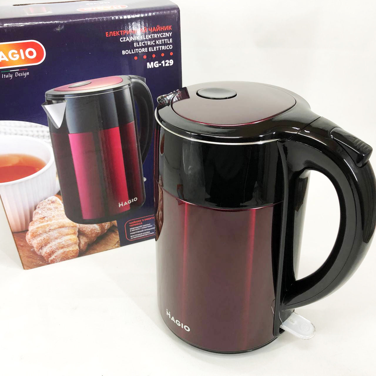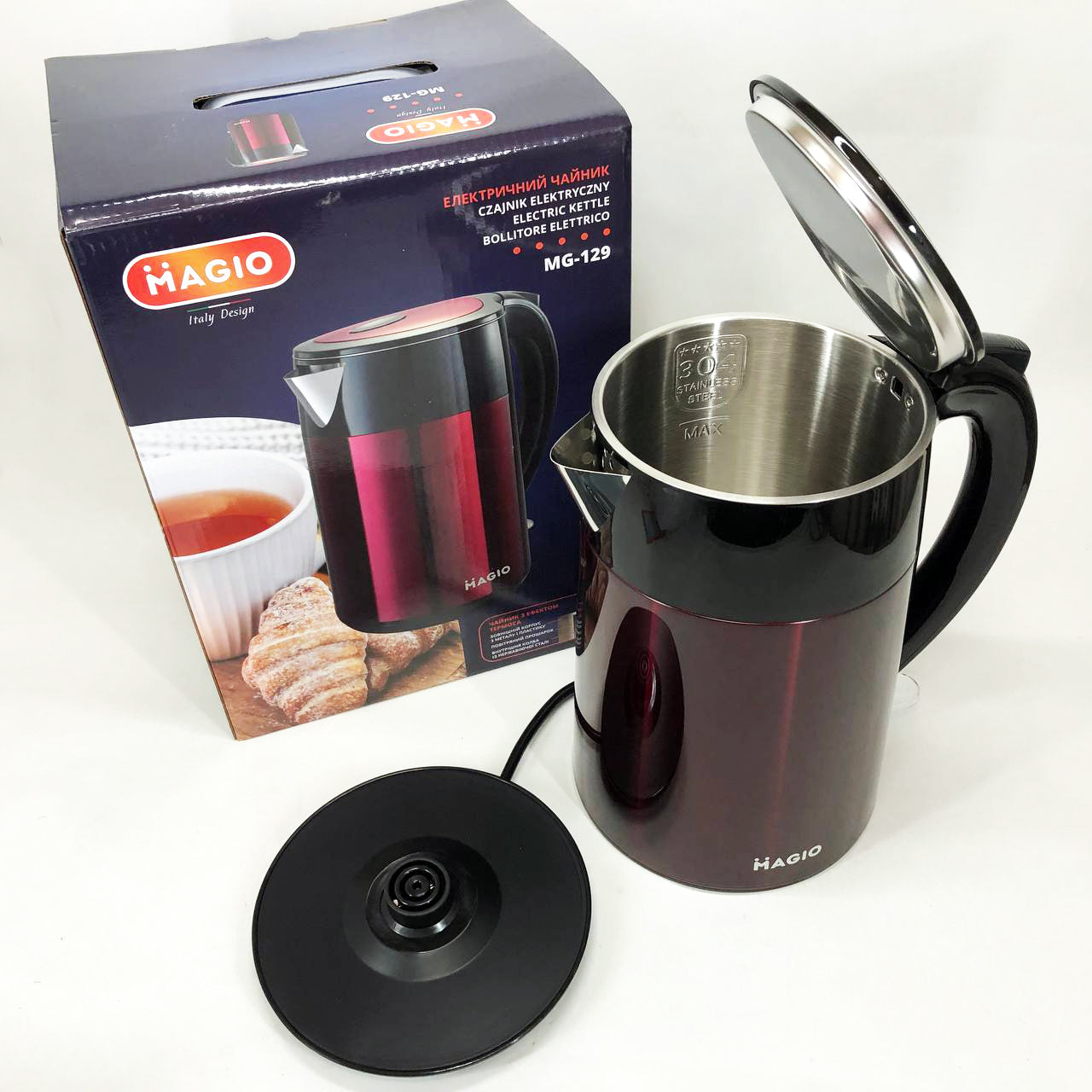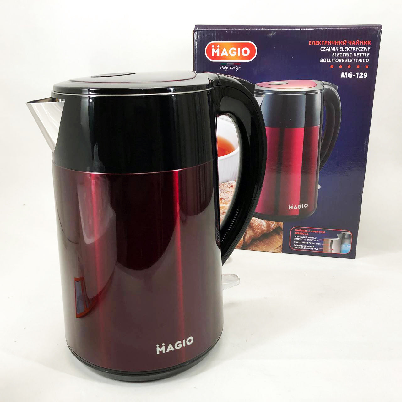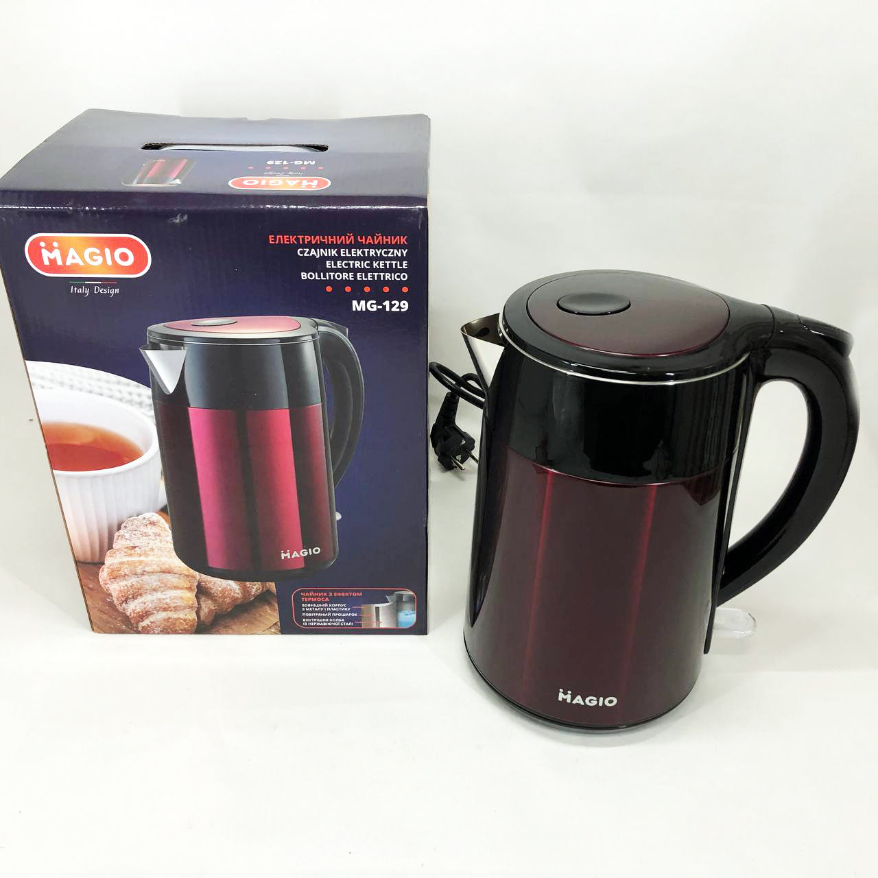 Электрочайник Magio MG-129 сочетает в себе функциональность и стильный дизайн. Объем 1.8 литра и мощность 1850 Вт обеспечивают быстрый закип воды, а двухслойный корпус с защитой от ожогов повышает безопасность использования.
