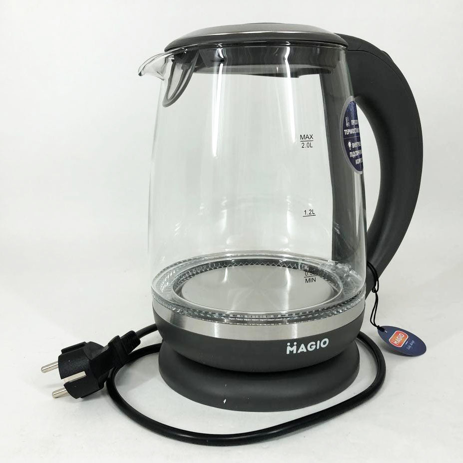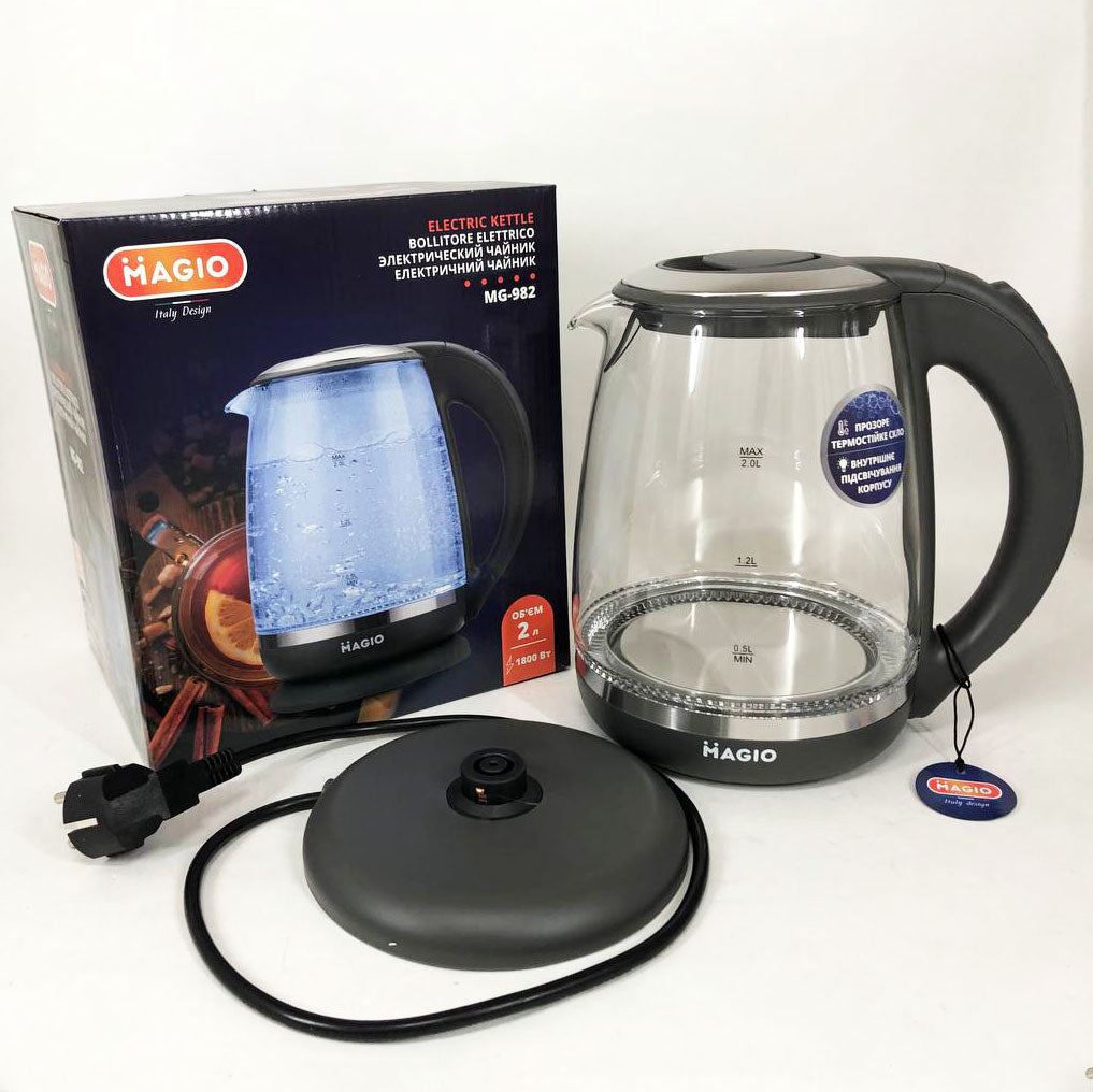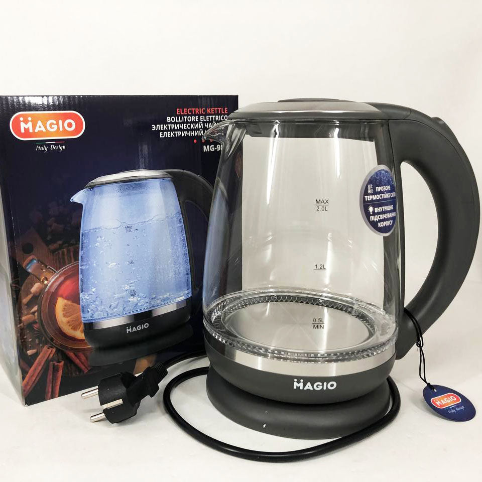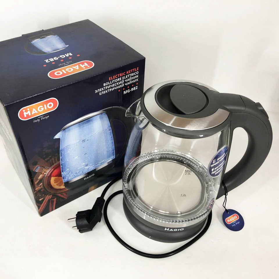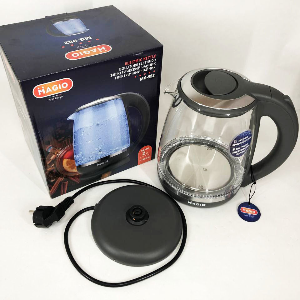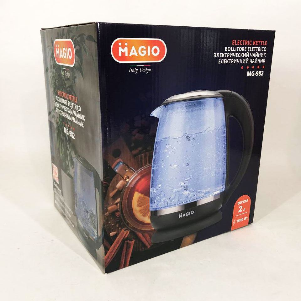 Электрочайник Magio MG-982 объёмом 2 л разработан для того, чтобы приготовить чашечку чая в один миг! Корпус сделан из прозрачного термостойкого стекла, благодаря чему в воде просто неоткуда появиться неприятным привкусам или даже опасным для здоровья веществам. Чайник оснащен подсветкой, которая эффектно загорается при кипячении воды и автоматически отключается при окончании процесса.