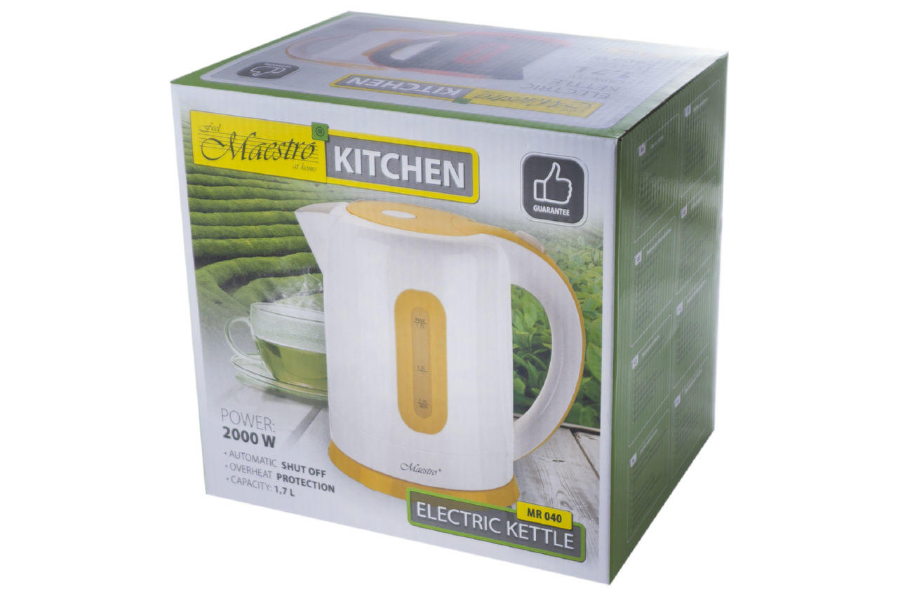 Электрочайник Maestro - MR-040 недорогая функциональная модель для дома. О включении прибора оповестит индикатор сети. А индикатор уровня воды позволит визуально контролировать объем и доливать воду по мере необходимости до нужной отметки. Показатель мощности в 2000 Вт не превышает возможности электросети, в отличие от более мощных моделей. Термостойкий пластиковый корпус не нагревается, поэтому риск получить ожог рук исключен. Объема в 1,7 литра хватит для чаепития большой семьи и гостей. Плоский нагревательный элемент, который скрыт под корпусом кипятит воду намного быстрее, чем модели с ТЭНами. Защита от перегрева сработает, если вы случайно забыли долить в чайник воды.