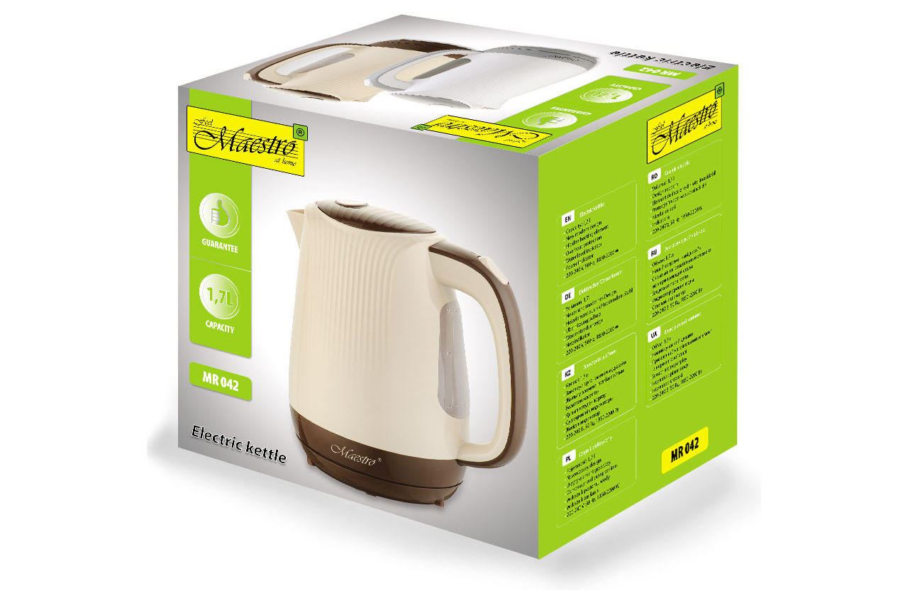 Электрочайник Maestro - MR-042 недорогая функциональная модель для дома. Индикатор уровня воды позволит визуально контролировать объем и доливать воду по мере необходимости до нужной отметки. Крышка открывается одни нажатие кнопки. Показатель мощности в 2200 Вт не превышает возможности электросети, в отличие от более мощных моделей. Термостойкий пластиковый корпус не нагревается, поэтому риск получить ожог рук исключен. Объема в 1,7 литра хватит для чаепития большой семьи и гостей. Плоский нагревательный элемент, который скрыт под корпусом кипятит воду намного быстрее, чем модели с ТЭНами. Защита от перегрева сработает, если вы случайно забыли долить в чайник воды.