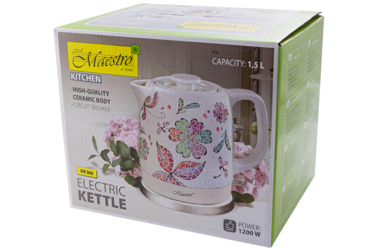 Электрочайник Maestro - MR-068 недорогая функциональная модель для дома. Показатель мощности в 1200 Вт не превышает возможности электросети, в отличие от более мощных моделей. Керамический корпус из экологически чистых материалов выдерживает высокие температуры. Объема в 1,5 литра хватит для чаепития большой семьи и гостей. Плоский нагревательный элемент, который скрыт под корпусом кипятит воду намного быстрее, чем модели с ТЭНами. Защита от перегрева сработает, если вы случайно забыли долить в прибор воды. Функция автоотключения обеспечит дополнительный комфорт от использования.