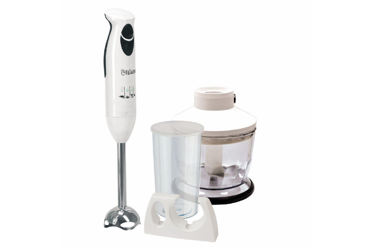 Сучасний ергономічний дизайн, можливість кріплення до стіни, зручність та простота в користуванні та чищенні, ножі з нержавіючої сталі (міні-подрібнювач, занурювальний блендер)