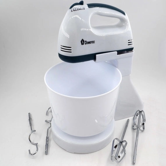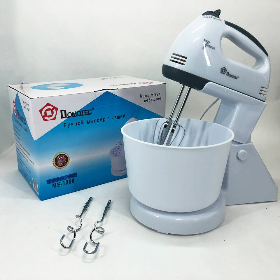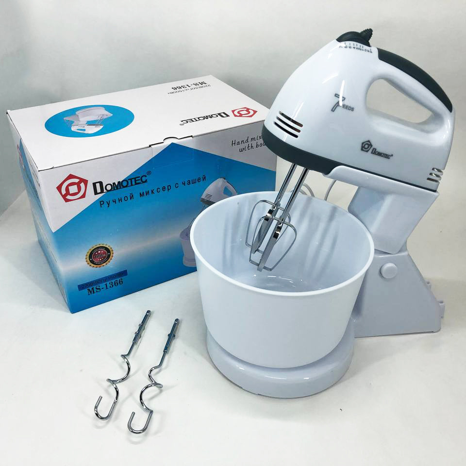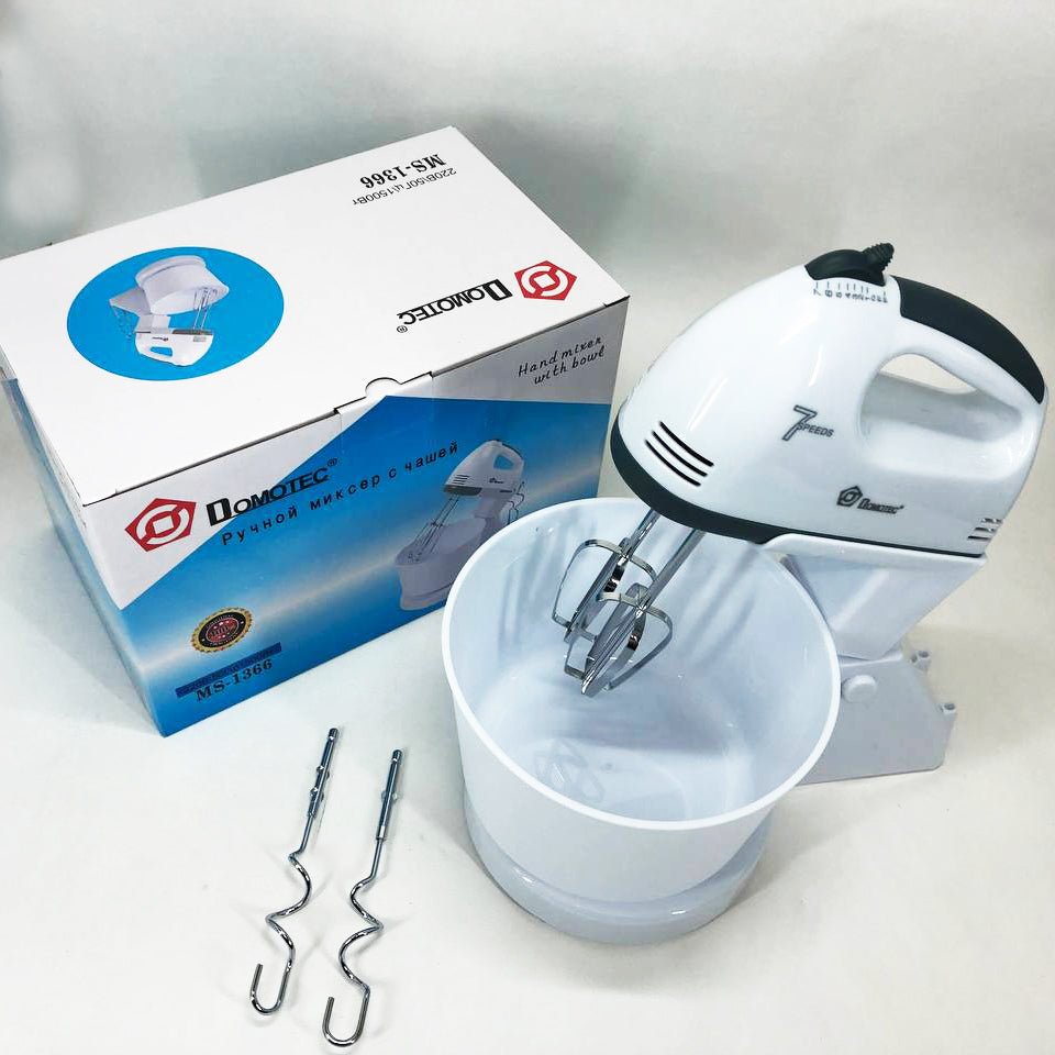 Міксер із чашею Domotec MS 1366 - дуже зручний, легкий у використанні та очищенні. Корпус міксера підставка та чаша виготовлені із пластику, а насадки з нержавіючої сталі, продумана до дрібниць ергономіка надає додаткового комфорту у використанні даного міксера. MS 1366 має 7 швидкісних режимів роботи для збивання продуктів різної густини, його потужність дозволяє легко збивати яйця, соуси або бісквітне тісто. У комплекті Domotec MS-1366 є велика чаша, на яку легко встановлюється міксер, тим самим перетворюючи його на стаціонарний прилад, що дозволяє звільнити руки на кухні. Також є два віночки для збивання і додаткові гаки для замішування тіста, що оцінять господині, які люблять радувати свою сім'ю різною випічкою.