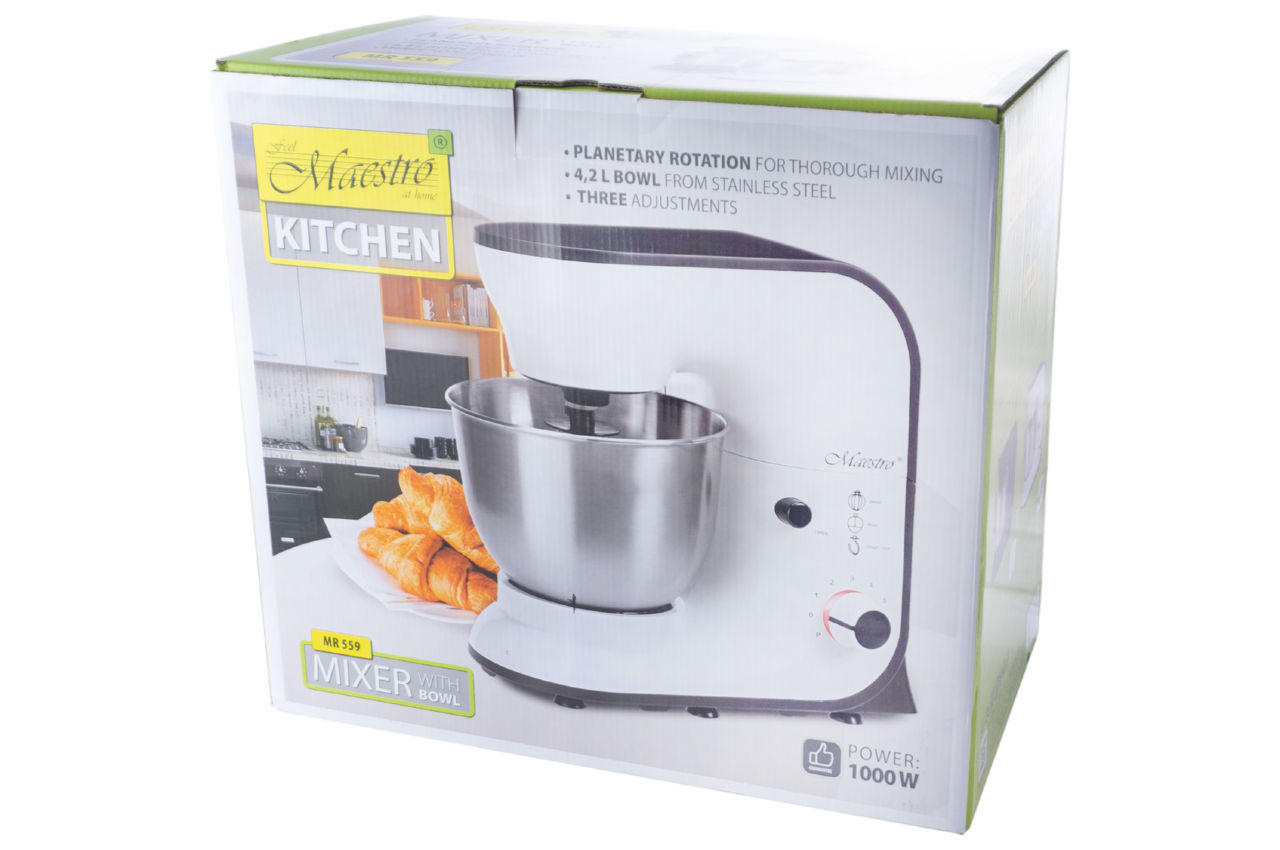 Планетарний міксер Maestro MR-559 відмінно справляється не тільки із замісом різних сортів тіста (білкове, бісквітне, листкове, заварне, дріжджове, пісочне), а й з приготуванням різних кондитерських мас (вершки, креми, муси, суфле, безе).