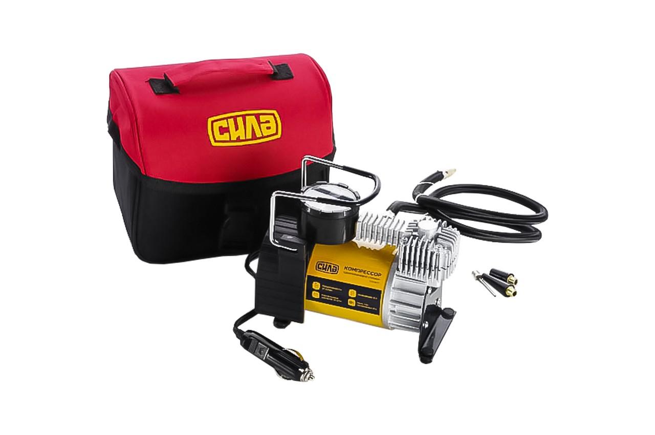 Автомобільний компресор Сила 12В х 10bar х 35л/хв. однопоршневий застосовується для накачування шин різної техніки та гумових виробів. Компресор має компактний розмір і зручну складну ручку для його переміщення. Гумові упори унеможливлюють перекидання приладу під час функціонування. У верхній частині розташований манометр контролю тиску повітря в шинах. До компресора додається зручний чохол на застібках. У такому чохлі прилад не тільки зручно зберігати, а й транспортувати його. Для нього завжди знайдеться місце у відсіку багажника будь-якого автомобіля. Довжина мережного дроту: 3 м; Максимальна тривалість безперервної роботи: 20 хв; Напруга: 12 В; Тип підключення: Прикурювач автомобіля