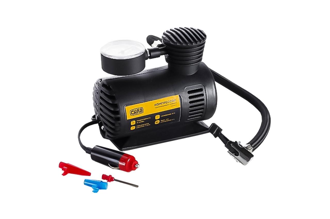 Автомобільний компресор Сила 12В х 7bar х 15л/хв однопоршневий застосовується для накачування шин різної техніки та гумових виробів. Компресор має компактний розмір і зручну складну ручку для його переміщення. Гумові упори унеможливлюють перекидання приладу під час функціонування. У верхній частині розташований манометр контролю тиску повітря в шинах. До компресора додається зручний чохол на застібках. У такому чохлі прилад не тільки зручно зберігати, а й транспортувати його. Для нього завжди знайдеться місце у відсіку багажника будь-якого автомобіля. Довжина мережного дроту: 3 м; Максимальна тривалість безперервної роботи: 15 хв; Напруга: 12 В; Тип підключення: Прикурювач автомобіля