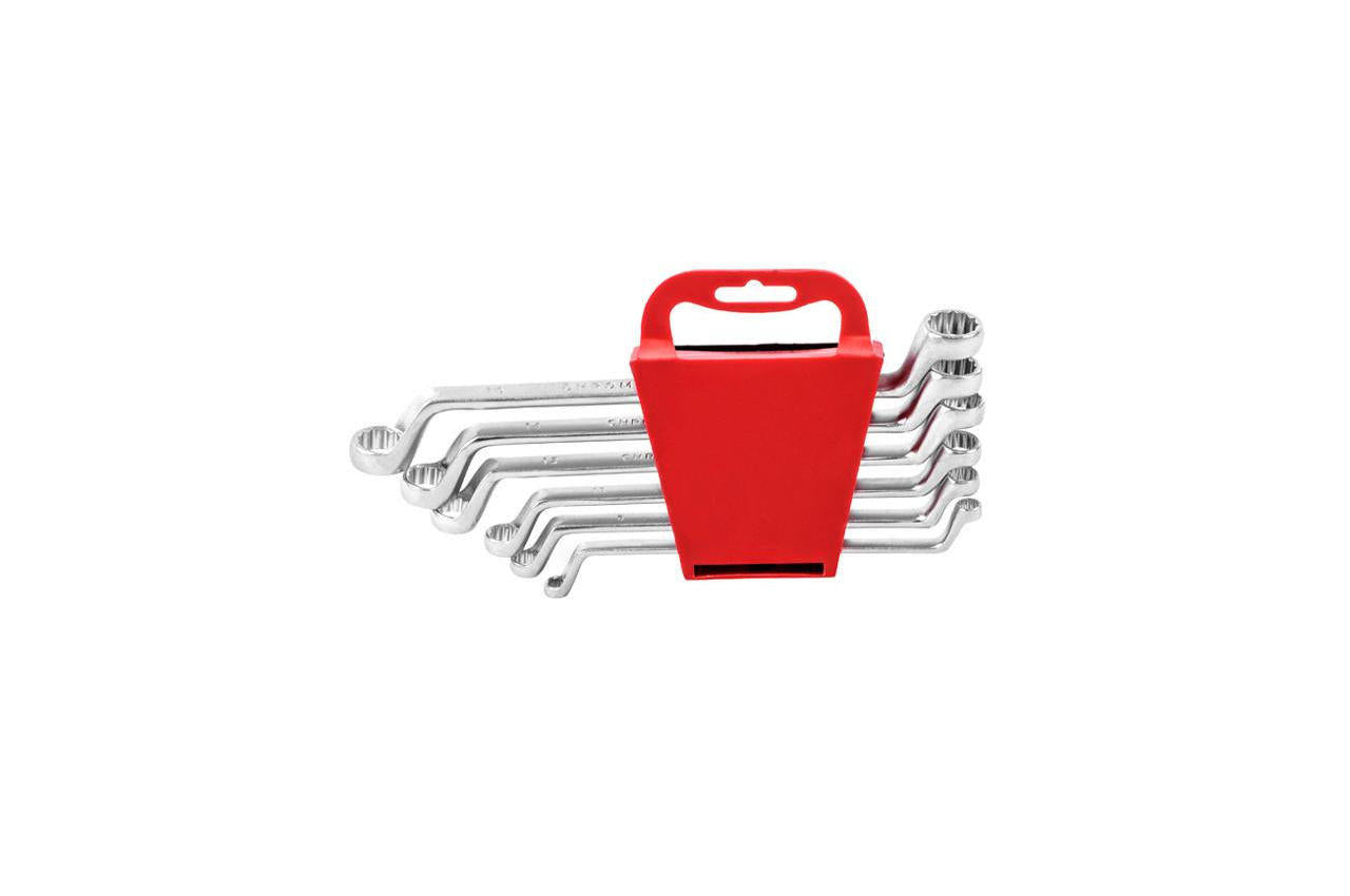 Набір із шести якісно виконаних накидних ключів. Розмірна лінійка: 6х7, 8х9, 10х11, 12х13, 14х15 та 16х17 мм. Ключі поставляються у зручному пластиковому утримувачі з отвором для підвішування. Хром-ванадієва сталь. Кількість ключів у наборі: 6 од.; Розміри: 6-17 мм