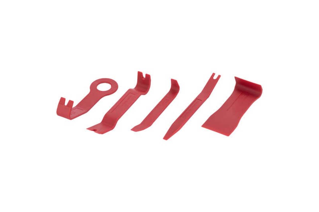 Комплект знімачів АТ-0150 призначений для швидкого та якісного демонтажу обшивки салону, декоративних панелей, молдингів та інших елементів інтер'єру. Цей набір складається з найпопулярніших наймачів, які відмінно підійдуть для розбирання салону автомобілів. У набір входять 5 предметів різної форми: з круглими, гострими, широкими та вузькими краями, що дозволяють працювати з більшістю панелей обшивки. На знімниках є спеціальні прорізи для демонтажу кріпильного кліпсу. Всі знімники дуже міцні та довговічні, адже виготовлені з нейлону, що чудово витримує навантаження на стиск та розтяг.