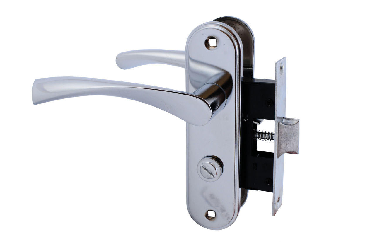 Дверна ручка на планці в комплекті з врізним замком під фіксатор. Матеріал: метал-планка/алюміній-ручка.
