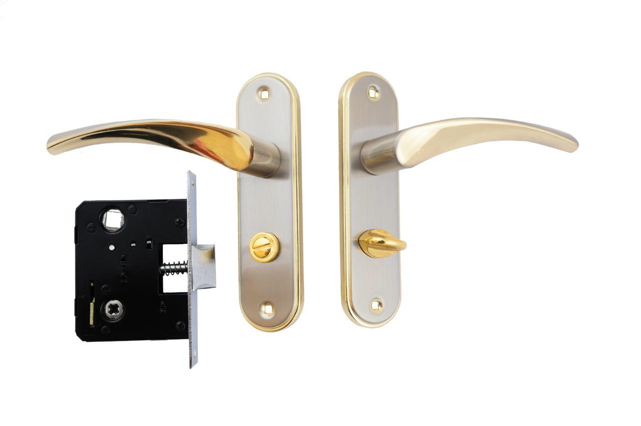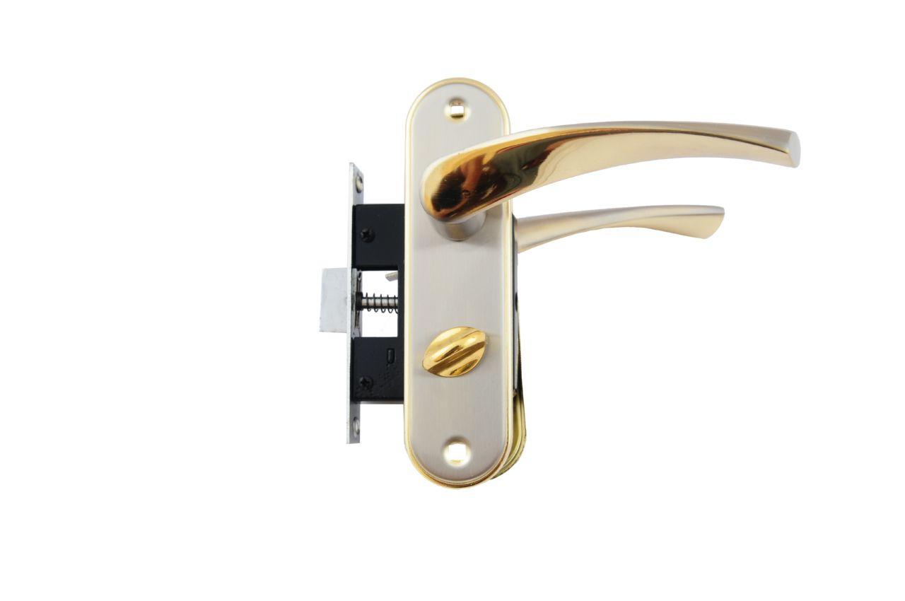Дверна ручка на планці в комплекті з врізним замком під фіксатор. Матеріал: метал-планка/алюміній-ручка.