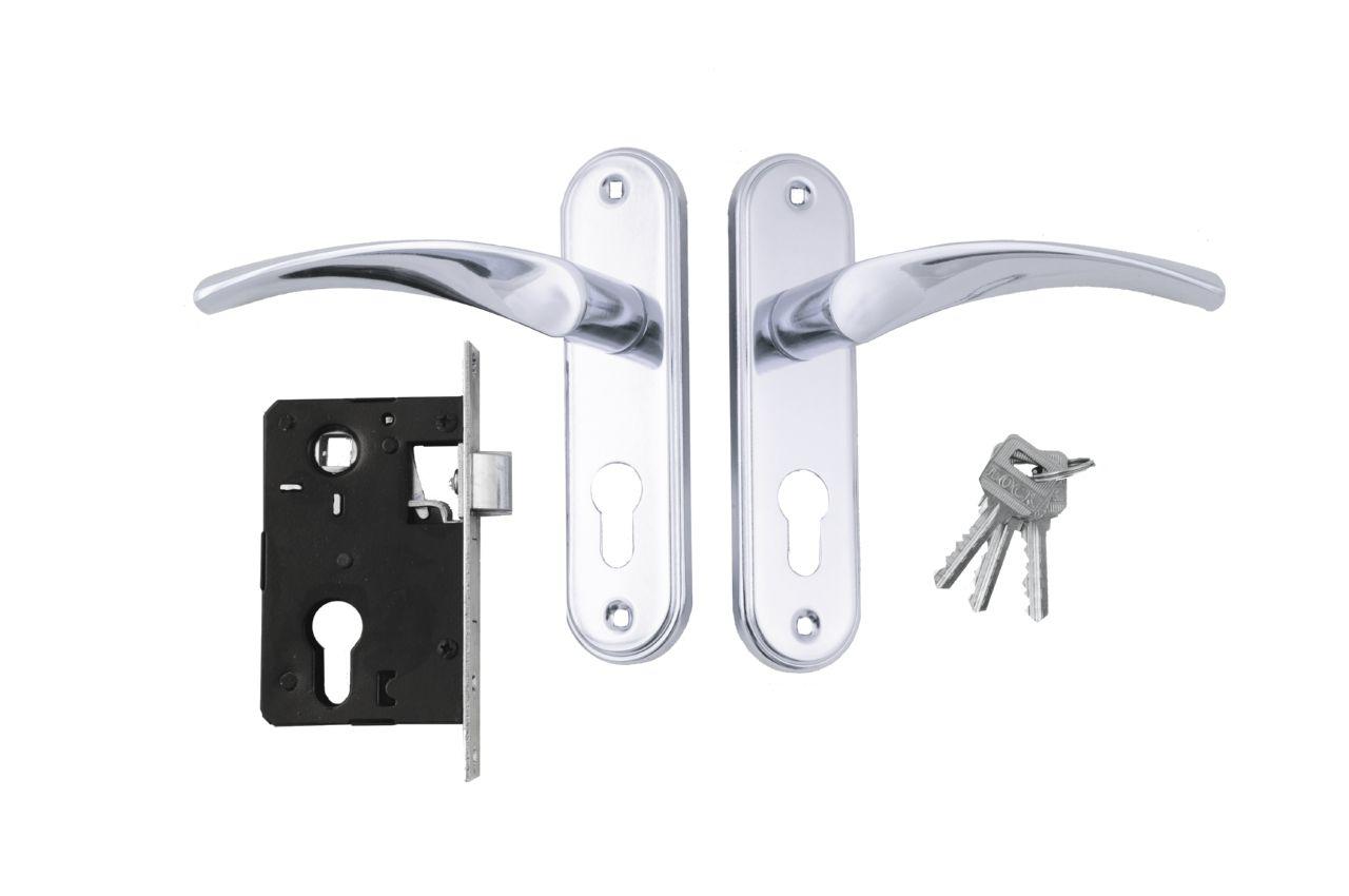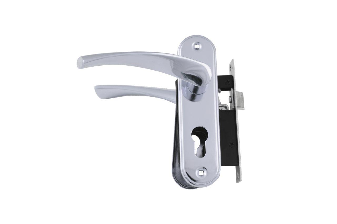 Дверна ручка на планці в комплекті з врізним замком під циліндр. Матеріал: метал-планка/алюміній-ручка.