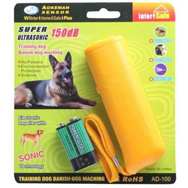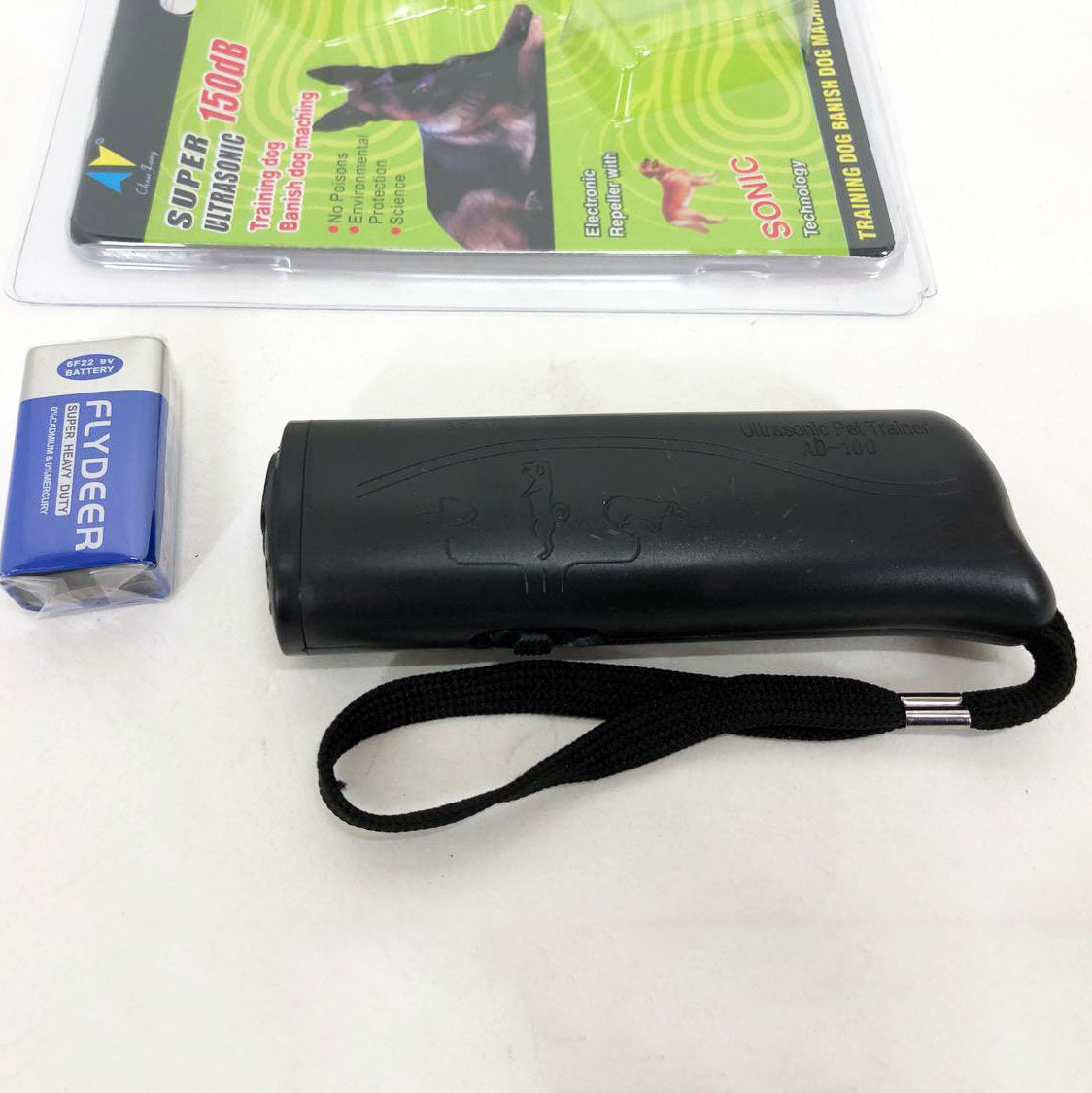 Мініатюрний відлякувач собак AD-100 являє собою електронний прилад, що носиться (зібраний в корпусі мініфонарика), що випромінює потужні ультразвукові коливання, чутні собаками і не сприймаються людиною. Випромінювання зупиняє агресивного собаку і звертає його втечу. Прилад особливо дієвий, якщо собака звернена у Ваш бік і поводиться загрозливо. Ультразвук не завдає собаці фізичної шкоди, а лише змушує її відчути сильний дискомфорт, панічний страх та бажання втекти. Найбільший ефект досягається при дії на агресивних бродячих собак.
