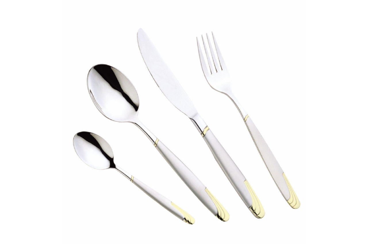 Столовий набір Maestro MR-1512G. В комплект входять 24 предмети, виготовлені з нержавіючої сталі: 6 столових ножів, 6 столових ложок, 6 виделок і 6 чайних ложок.