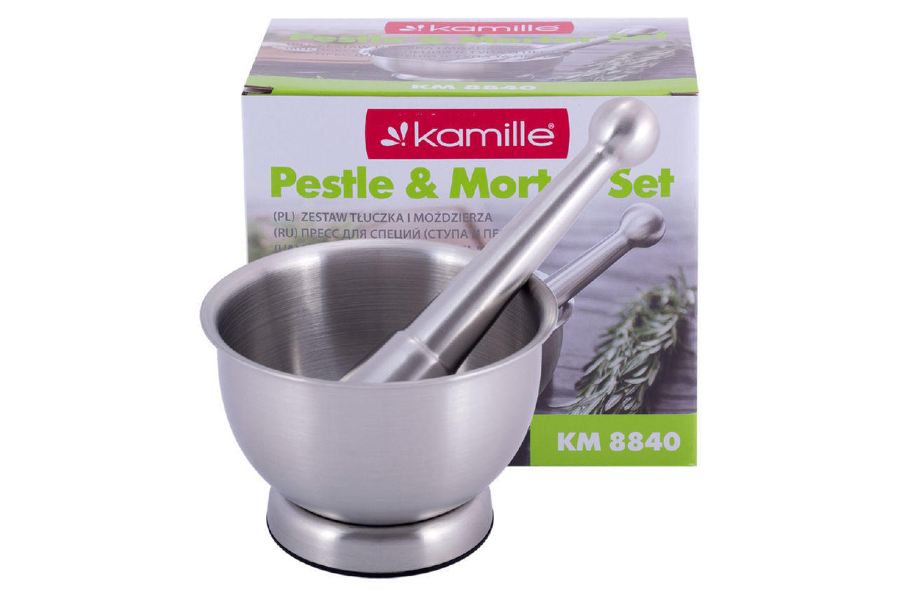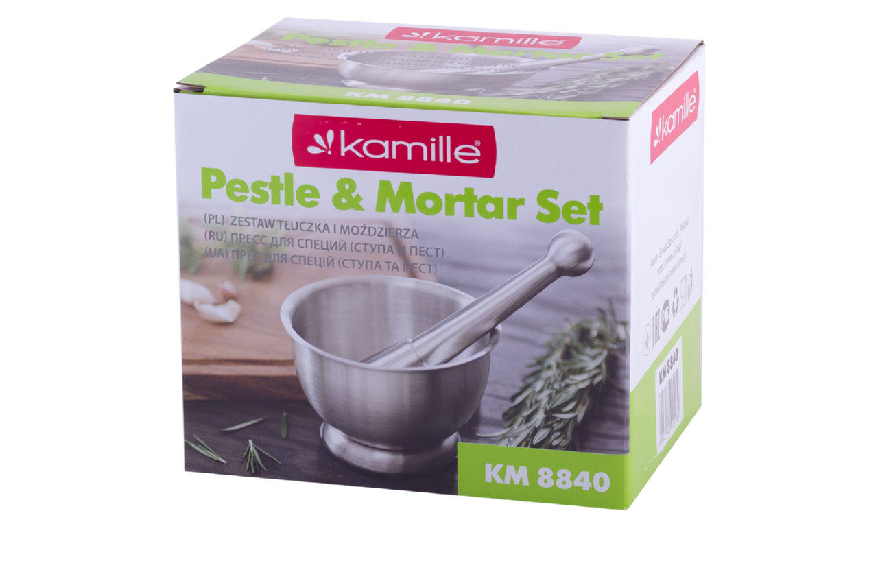 Сталева ступка Kamille знадобиться для кожної господині, яка любить радувати своїх близьких натуральною та смачною їжею. Ступка призначена для розтирання різних спецій, трав та приготування ароматних соусів та заправок. Не вбирає запахи і тому всі спеції, приготовані в ступці, збережуть свої аромати для ваших страв і не змішуються з ароматами приготовлених раніше ступки.