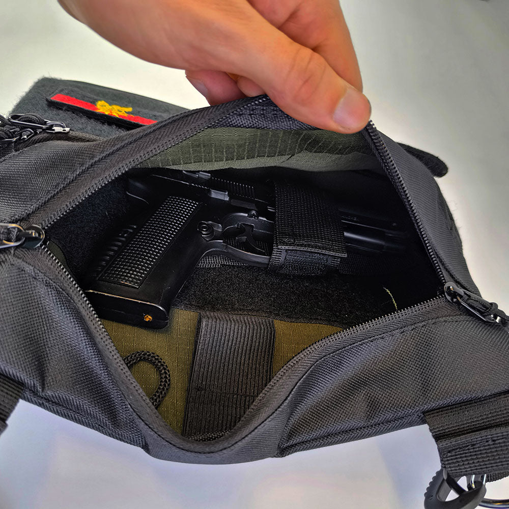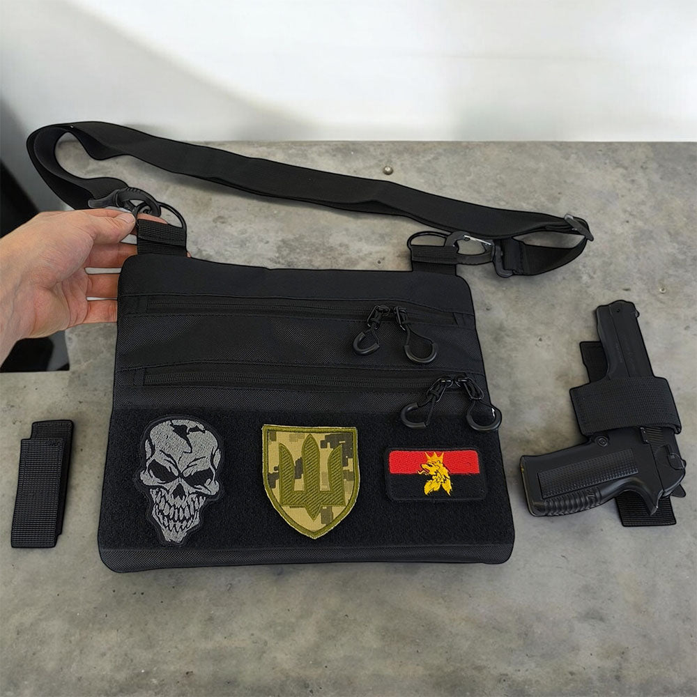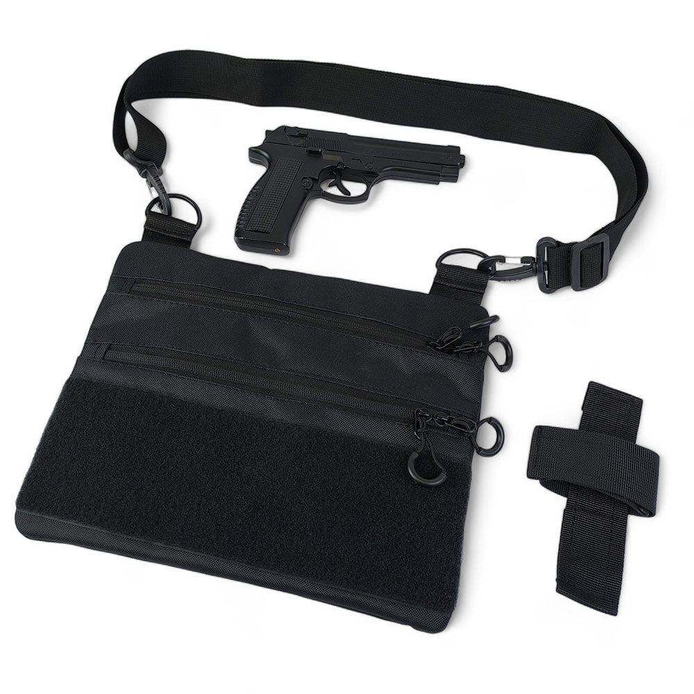 Ця елегантна і практична тактична сумка-кобура в чорному кольорі є відмінним рішенням для прихованого носіння пістолета.