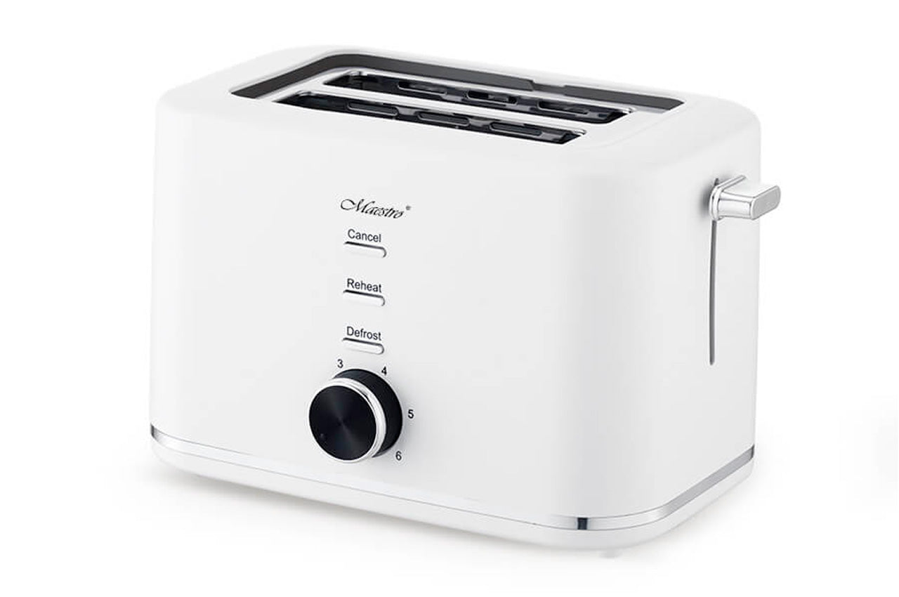Тостер Maestro MR 703 потужністю 700 Вт з 6 режимами прожарювання випускається у зручному пластиковому корпусі білого кольору. У торці корпусу розташовані ручка перемикач режимів та кнопка "стоп". Тостер призначений для підсмаження шматочків хліба з можливістю утворення хрусткої скоринки.