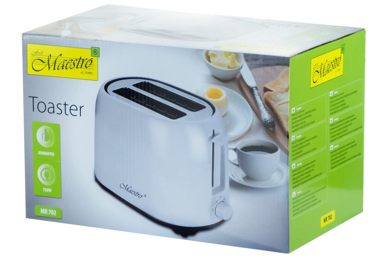 Тостер Maestro MR-702 представлений у вигляді компактного, зручного та стильного кухонного приладу для підсмажування шматочків хліба одночасно з двох боків. Потужність приладу 750 Вт дозволяє засмажувати шматочки хліба за короткий проміжок часу. Щоб хліб не підгорів, в конструкції тостера передбачений регулятор, за допомогою якого кожен член сім'ї зможе індивідуально контролювати ступінь підсмажування.