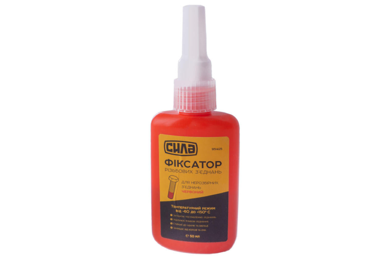 Фіксатор різьблення для нерозбірних з'єднань Сила – 50г червоний. Використовується для фіксації та герметизації різьблення. Захищає різьблення від іржі та корозії та запобігає ослабленню різьбових з'єднань від вібрації.